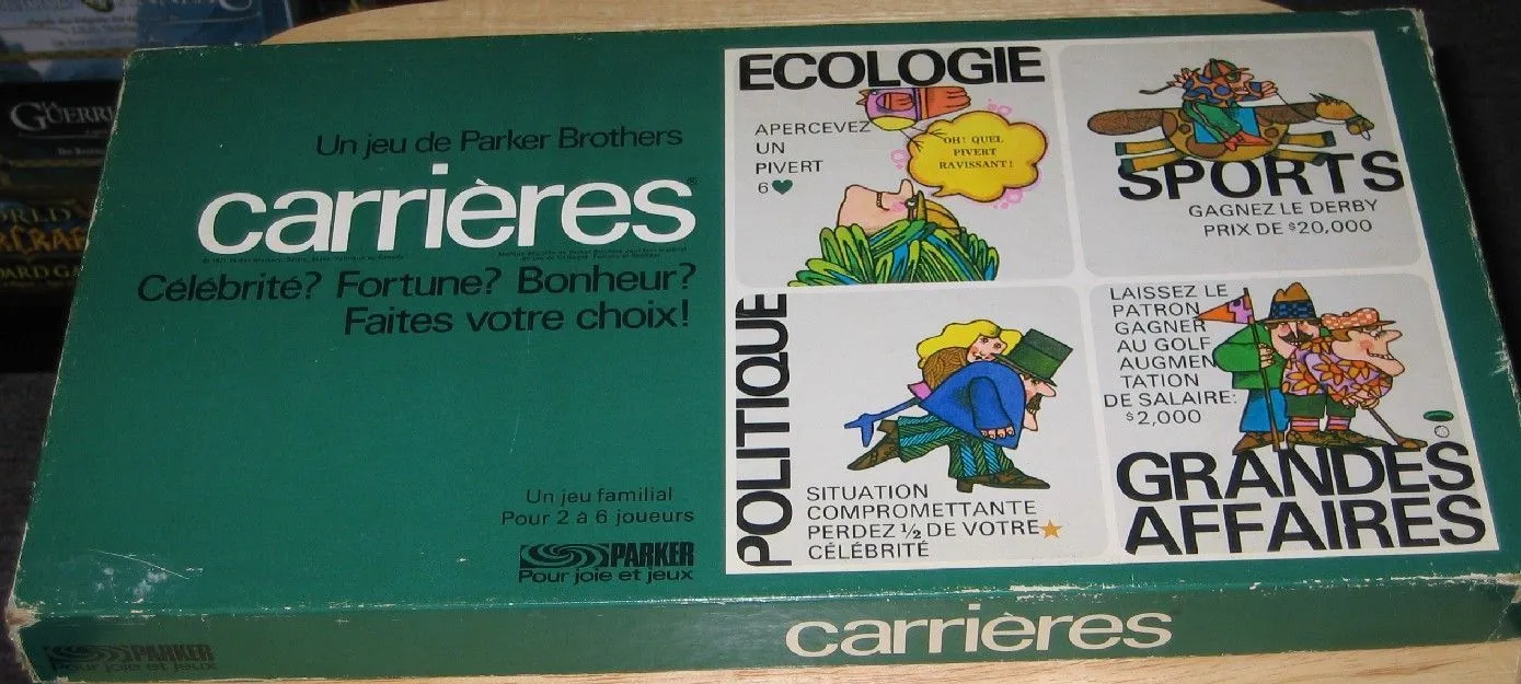 Careers is a game where the players set their own victory conditions. A player may choose to pursue Fame, Happiness, Money, or a combination of all three. The limitation being that the total number of “points” earned in the 3 categories must total 60. eg. 60 Happiness, 0 Fame, 0 Money; 20 of each; or any other combination. The players endeavor to fulfill their goal by going through any number of different “occupation paths”. All paths have some prerequisite for entry, and benefits accrue from going through any of the paths more than once. The different occupations are designed to be suited to different strategies, eg. Hollywood is good for fame points, while “Going to Sea” is good for happiness. In the end it is the player (or team of players) who gets to their pre-set goal first who will be the winner, and achieve everything they ever wanted in life.