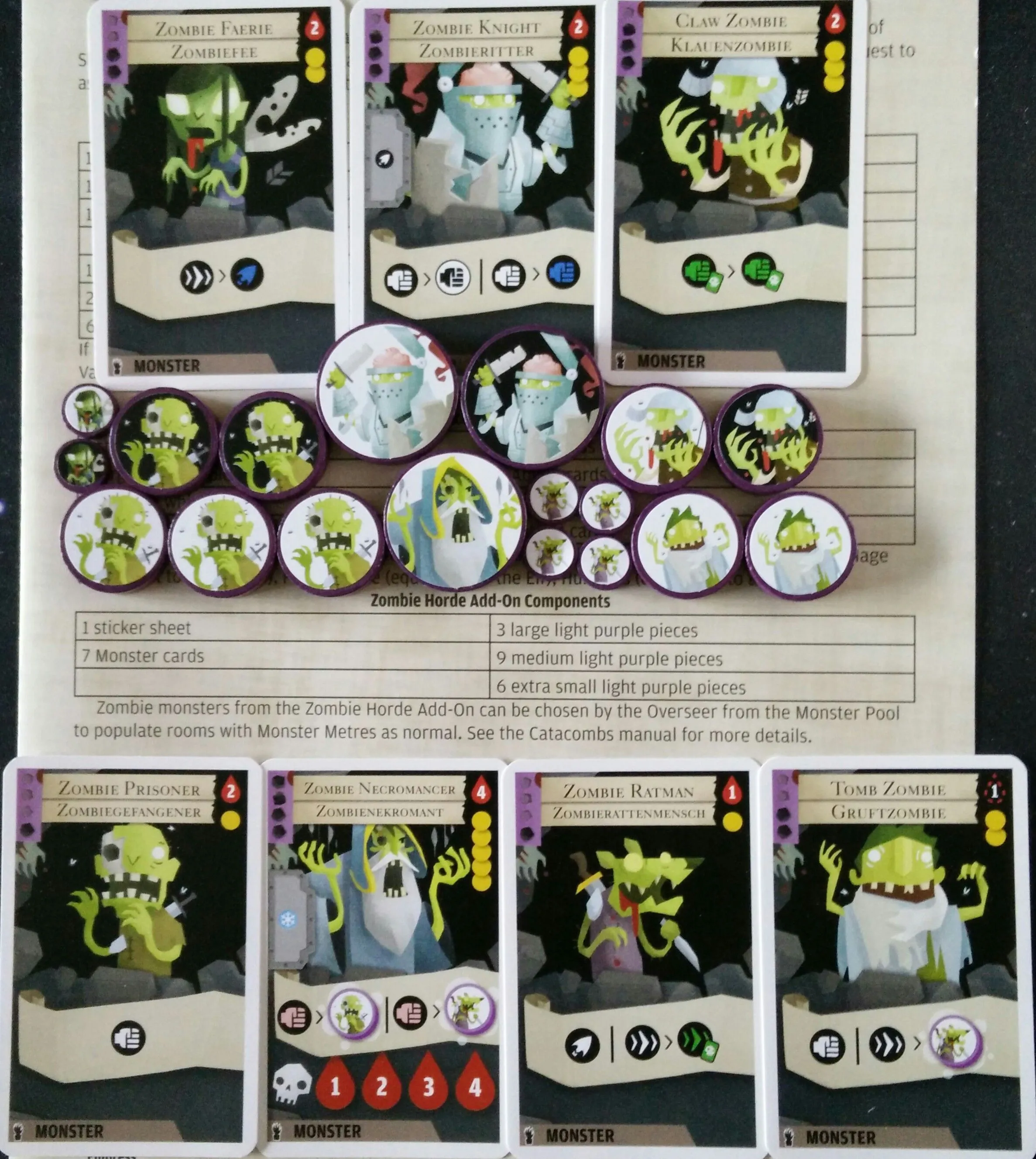 In more detail, in Catacombs players flick wooden discs that represent the monsters and heroes. Contact with an opposing piece inflicts damage, while missiles, spells, and other special abilities can cause other effects. When all of the monsters of a room have been cleared, the heroes can move further into the catacomb.
