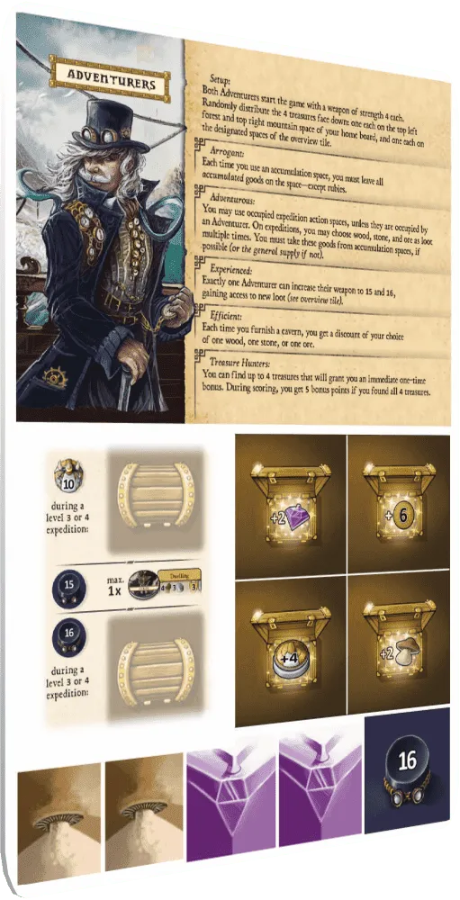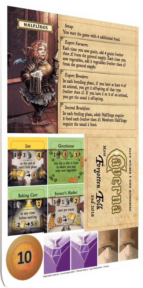 Dans Caverna, vous incarnez des nains aventureux vivants reclus dans leurs cavernes. Vous creuserez grottes et tunnels à la recherche de rubis et de minerai, et les aménagerez pour créer, tant des espaces habitables que des zones de travail. Vous aurez besoin de minerai pour forger les armes indispensables aux expéditions que vous entreprendrez, en quête d’aventures et de butins. Les rubis sont une ressource précieuse et éminemment souple : vous pouvez les échanger contre des ressources et des tuiles Terrain à tout moment. Devant l’entrée de vos cavernes, vous chercherez à assurer votre subsistance en abattant des arbres, en élevant des animaux et en pratiquant l’agriculture. Caverna est la prochaine évolution du classique Agricola. Dans ce jeu de gestion, vous continuerez de cultiver, d’élever et d’aménager votre habitation, mais vous aurez aussi à explorer les mines. En plus d’aménager les cavernes, vous découvrirez également d’autres moyens de recevoir des ressources. De plus, vous pourrez jouer jusqu’à sept joueurs!
