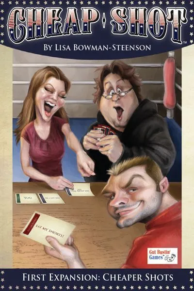 Cheap Shot is a rummy-style game of insults, with each player starting with a hand of seven cards, which take the form of subjects, conjunctions, verbal phrases, and retorts. On a turn, the active player tries to use the cards in hand to create an insult: “Your Secret Boyfriend / is a drama farmer / and / tells only lies.” Unless the targeted player can come up with a block card, such as “Oh grow up!”, the insult will stand as points. The more cards in the insult, the more points you score!