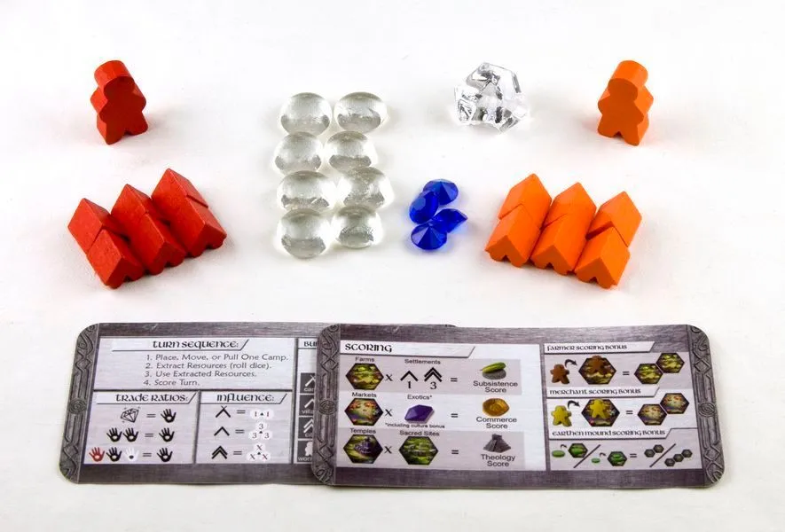 Specifically, the players claim domains by building camps, upgrading those camps to villages, and ultimately into great cities. The various settlement types project varying degrees of influence over the domains. By controlling the domains,the players will earn a number of different victory point multipliers (including farms, markets, temples, and sacred sites). In addition the players will use their settlements to control three kinds of resource dice (forest, mountain, and desert dice). Each respective dice type offers a unique set of odds for resource procurement (forest dice offer much wood, some clay, and an occasional exotic good; mountain dice offer much stone, some metal, and an occasional exotic good; finally desert dice offer equal odds of wood, stone, clay, and metal, with a greater chance for exotic goods.