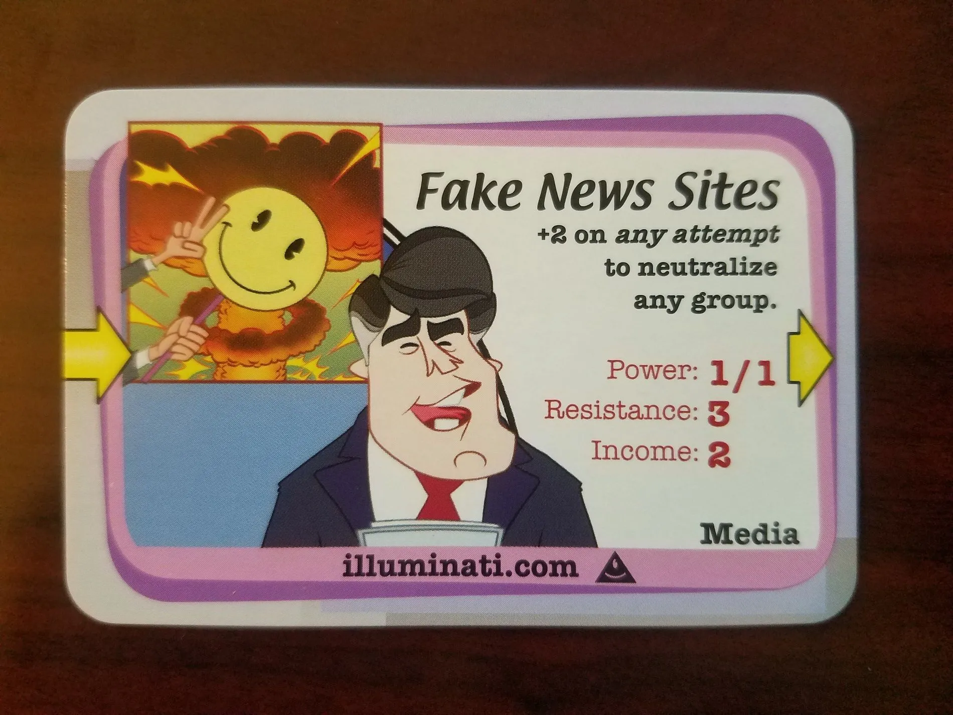The content and mechanics of the Second Edition have been revamped for the twenty-first century, dropping the Cold War-era Government/Communist alignments and adding a new alignment, Media, for the information age. The cards have been redesigned with cartoon-style artwork by Lars DeSouza, and updated to reflect modern political and social conflict: now the Russian Campaign Donors can work with Antifa to take control of Furries, or destroy the Hipsters.