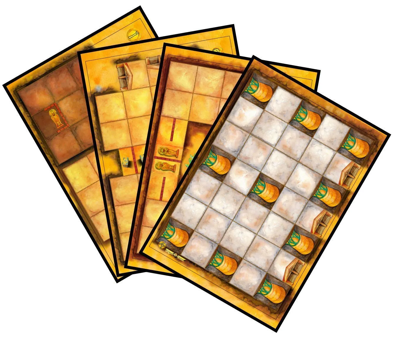 Das Labyrinth des Pharao includes rules for solo play as well as an advanced variant in which treasures are worth 1-3 points depending on their color, with this point value then multiplied by 1-4 depending on where its shared wall meets the corridor. The deeper the treasure along the path, the more points it’s worth.