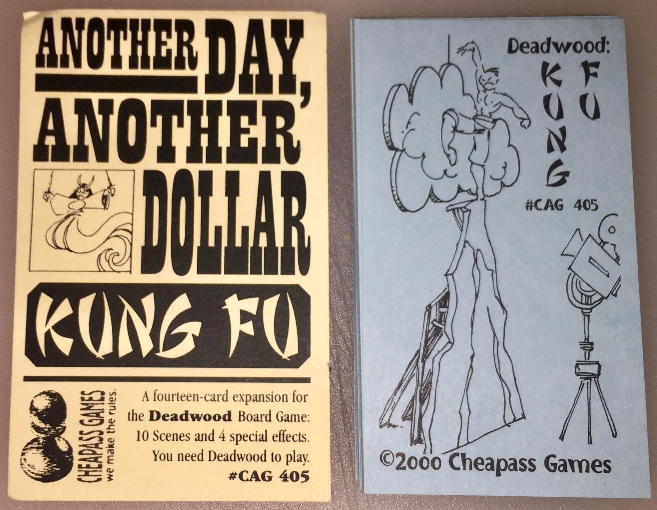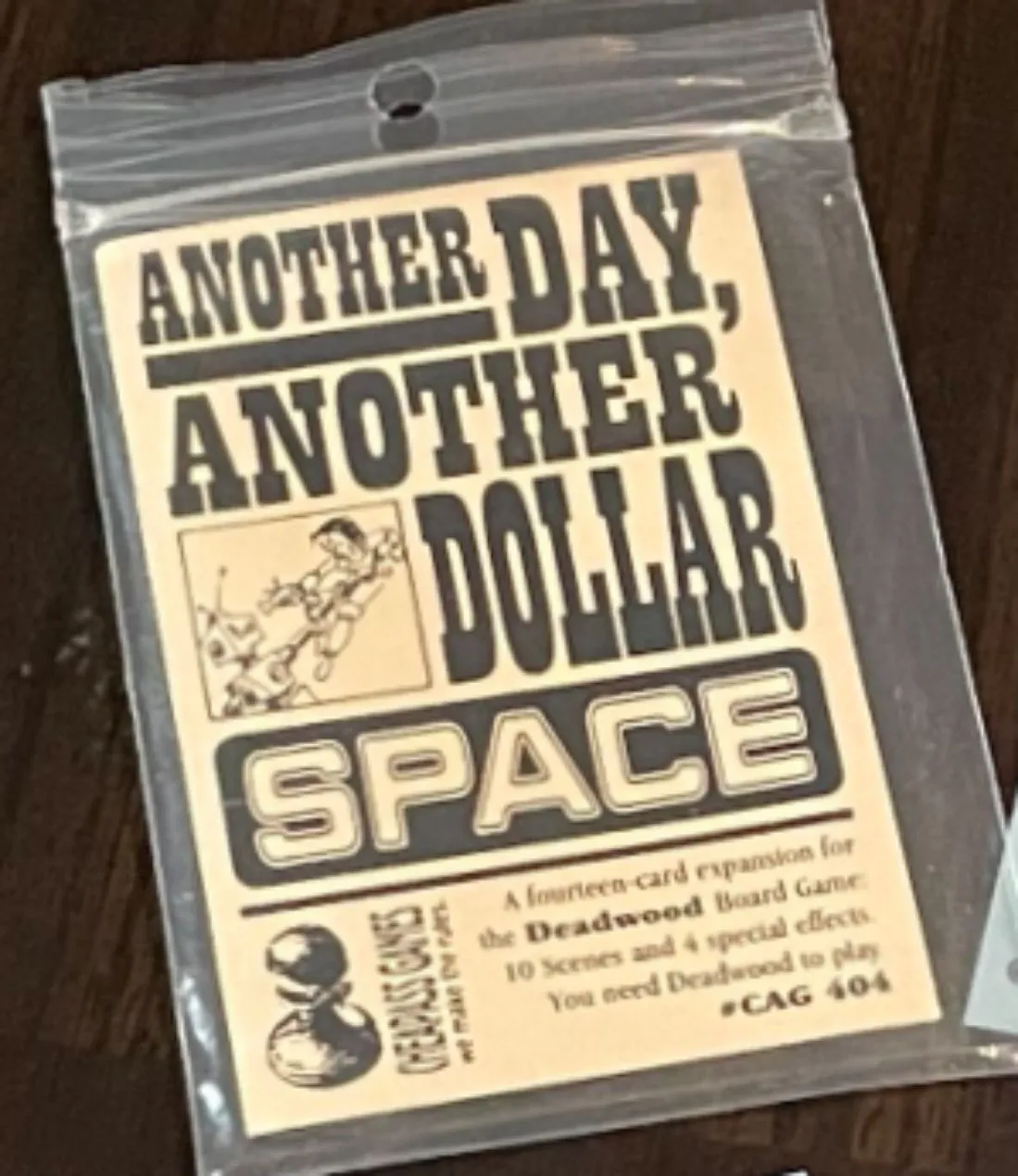 In Deadwood Studios USA (originally published as Deadwood), players wander across the backlot each day, looking for acting jobs. Your actor is a six-sided die, and the number on top represents your status. (These dice are never rolled; they just show your status.) After you take a role in the movie, you can roll a die and try to “act”, or you can “rehearse” to improve your odds. As you work, you’ll earn money and fame, and you can trade those things at the casting office for higher status, which brings you the ability to take better-paying roles.