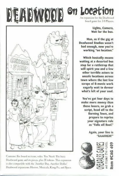 Time to film the latest western being produced at Deadwood Studios, makers of terrible western movies. All the special roles are up for grabs: “Man falling off roof”, “Crying woman”, “Stagecoach driver”, “Dead man”, and more. Yes, they’re all available, and if you’re good enough – that is, if you progress up through the “hack” levels represented by the number on your character’s die – you may even get to play that complicated character part “Rear-end of Horse”!