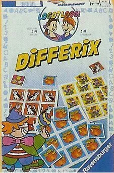 Differix is a pattern recognition puzzle that can be played as a solo activity, or competitively as a race to see which player can place the most correct tiles in a set time. The various versions of the game have four or six game boards of increasing difficulty that each display nine illustrations with the same motif (ex. an elephant, a juggling frog or a tightrope dancing pig). Each of the illustrations differs from the others in only a minor detail or change of position, so that players are required to scrutinize them closely in order to match tiles and the pictures on the boards correctly.