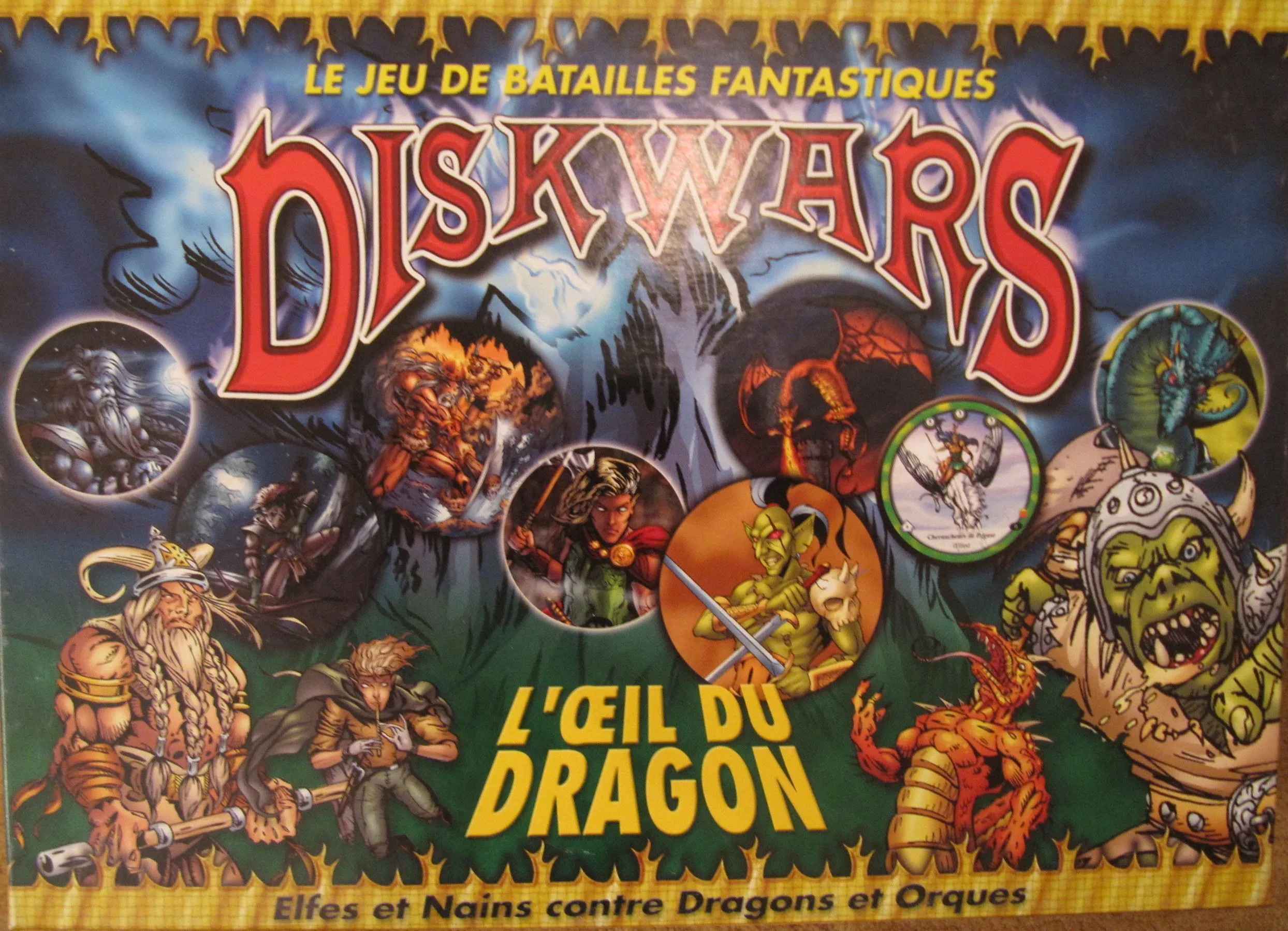 Each double-sided disk represents either a faction homeland (your starting area), a terrain (ruins, forest, swamp etc⦠with effects on combat and line of sight), a spell(levels 1-3), a missile or one unit with its alignment (Good, Neutral, or Evil) with values for its Attack, Defense, Toughness, Movement and the army point cost of the disk. The disks have varying sizes (Giants and Dragons tend to be larger) and most units have a wide variety special abilities such as flying, the spell-casting ability or the missile ability to launch boulders, bolts, arrows or fireballs for example. Players take it in turn activating 3 units(disks) and resolving battles, casting spells, and firing missiles.