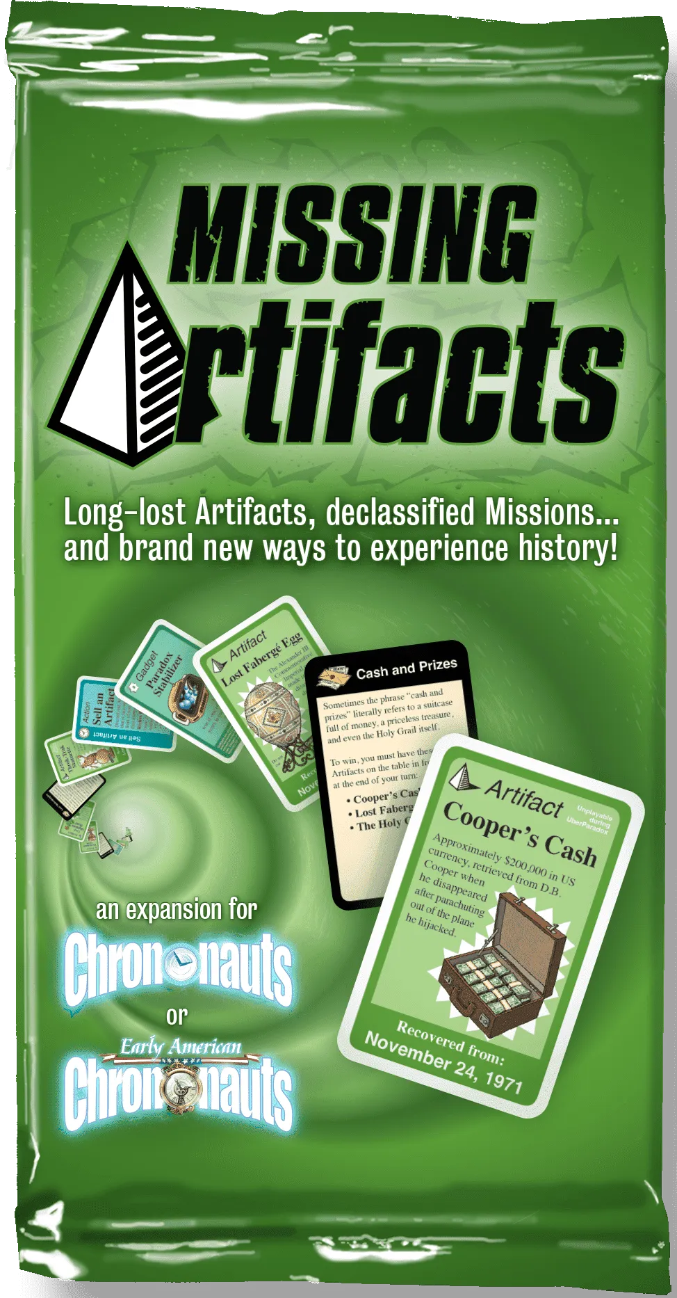 Early American Chrononauts is a stand-alone prequel to Chrononauts, also from Looney Labs. The all-new TimeLine begins just before the American Revolution in 1770 and continues through the Civil War, stopping at 1916. As with Chrononauts, players travel through time to change linchpin events, patch paradoxes, and collect artifacts.