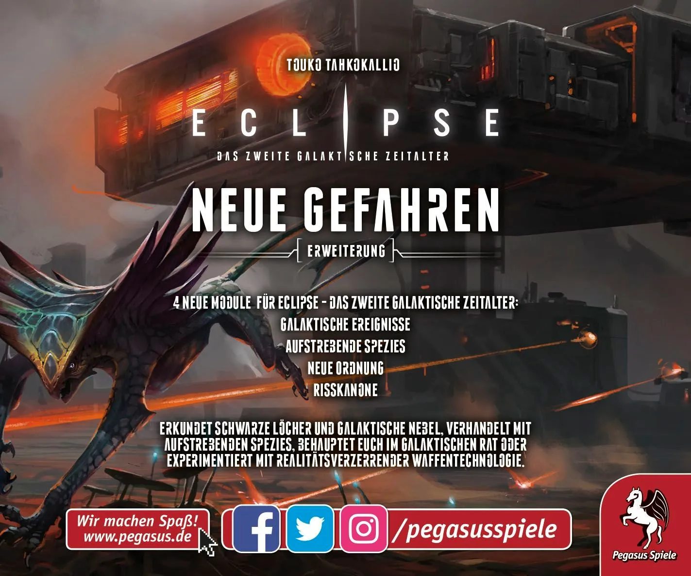 Eclipse : Second Dawn for the Galaxy vous place aux commandes d’une vaste civilisation interstellaire. À l’issue de la guerre Terran – Hegemony (30 027 – 33 364), les principales espèces spatiales ont redoublé d’efforts pour instaurer et stabiliser la paix. Mais aujourd’hui, la tension et la discorde grandissent à nouveau parmi les sept principales espèces du Conseil lui-même. Les anciennes alliances se brisent et de nouvelles sont conclues en secret. L’affrontement entre ces superpuissances semble inévitable ! Vous avez pour mission d’étendre votre civilisation en explorant et colonisant de nouveaux secteurs, en développant la recherche technologique, ou encore en construisant des vaisseaux, équipés pour le combat spatial. À son tour, chaque joueur sélectionne des actions pour atteindre ses objectifs, en gérant soigneusement ses ressources, ou en s’engageant dans des batailles épiques. À vous de gagner le plus de points de victoire en 8 tours. Pour cela, vous devrez gagner vos combats, former des relations diplomatiques, prendre le contrôle des monolithes, faire de grandes découvertes et mettre à jour de nouvelles technologies. Il existe de nombreux chemins vers la victoire, vous devez donc planifier votre stratégie en fonction des forces et des faiblesses de votre espèce, et garder un œil sur les efforts des autres civilisations.