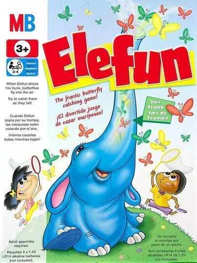 A motorized elephant blows nylon butterflies up into the air. Players try to catch them in their nets (or gather them up from off the floor). The player who gathers the most once the elephant is finished blowing earns a butterfly token for their net. Also, the player who catches the special blue butterfly also wins a token. The first player to get three butterfly tokens wins! In alternate editions, the golden butterfly is an instant win, and otherwise simply getting the most butterflies makes you win.