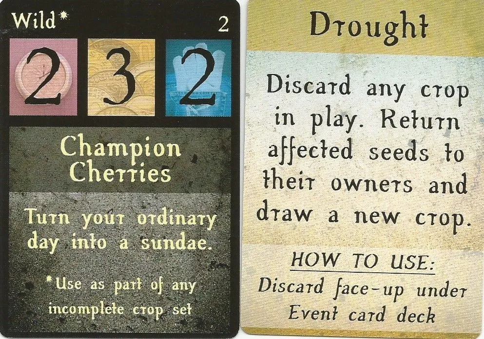 Gameplay: Each player is given a deck of 6 Seed cards consisting of 2 time, 2 money, and 2 labor cards. During your turn, you will draw the top 3 Seed cards from your deck. You will try gain insight into one of the return/harvest values assigned to the crops in play. With that information and the seeds you have in-hand, you will play 2 of the 3 seeds in your hand on any of the crops in play. Special earned event cards may also be played during your turn to further your success.