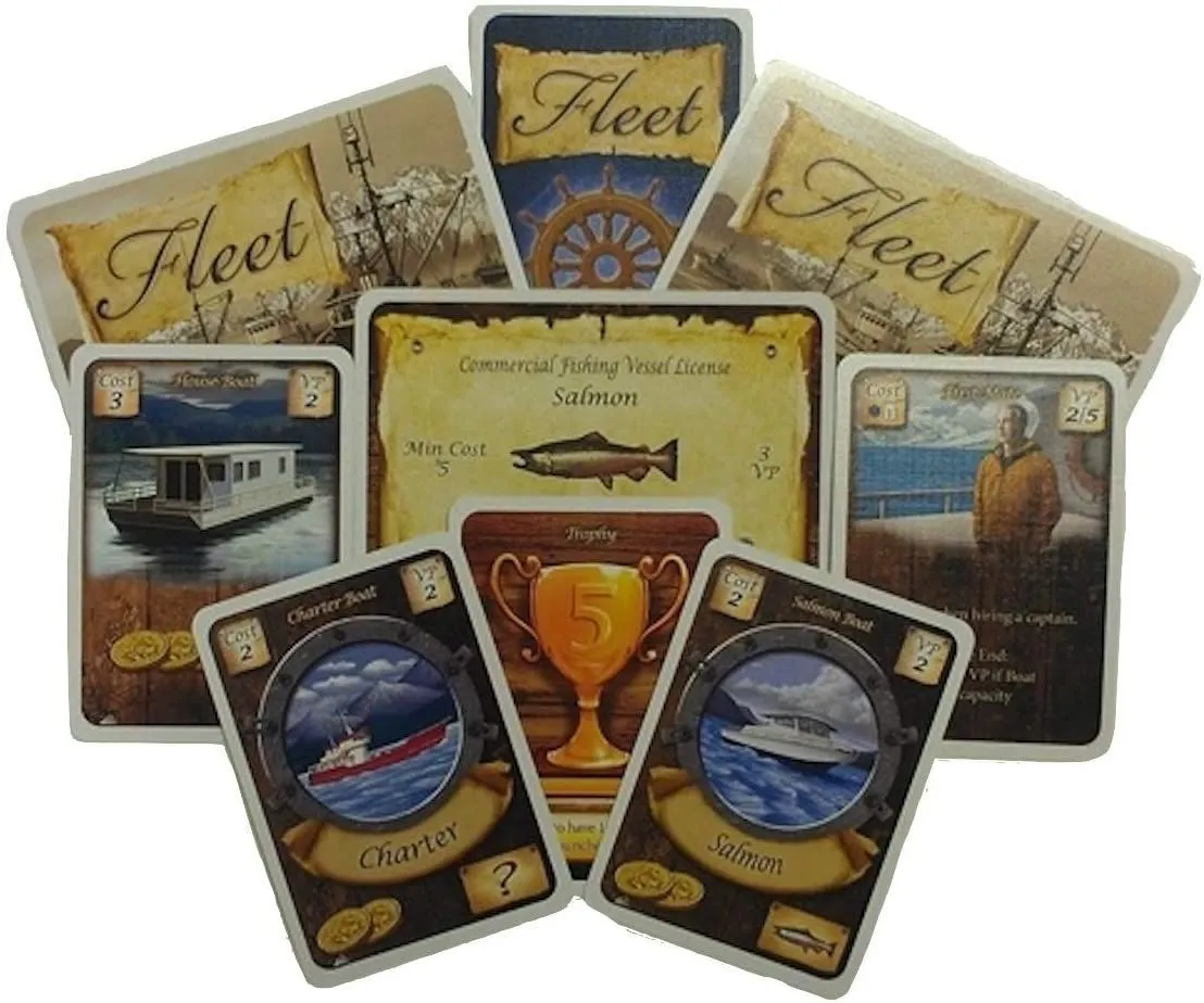 Fleet is an exciting, strategic card game with in-depth decisions and thrilling game play that new and experienced gamers can enjoy! In Fleet, you’ll acquire licenses, launch boats, and fish the great briny blue. The player who best manages his resources and acquires the most VP via fish, licenses, and boats will build the strongest fleet and lead his crew to victory!