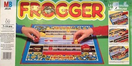 This is another of Milton Bradley’s 1980’s video-game themed board games. This is based on the arcade and home-system smash hit Frogger. In this version of the game, 2 players face off, each with their own army of frogs, logs, and automobiles. Each turn, a player spends his movement points either moving his frogs toward their goal (the other side of the board), or moving logs and cars in an attempt to block or squash the other player’s frogs. Complete with “bonus points” for landing on flies, this is actually a pretty faithful interpretation of the video-game; but far too simple to have any long-lasting interest. More of a curiosity for video-game enthusiasts than anything.