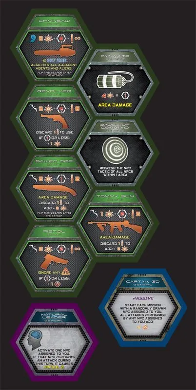 Alien cards, which define the behavior of each different alien and detail its skills and combat abilities. Close Encounter cards, which are used at the beginning of each alien turn to determine which aliens activate.