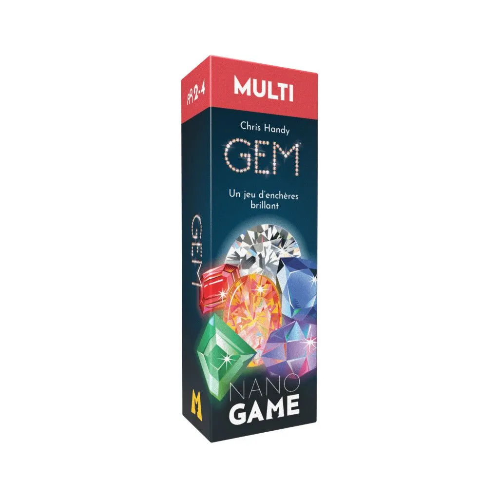 GEM, un jeu d’enchères de la gamme Nanogame Achetez, activez, dépensez, optimisez ! Dans Nanogame GEM vous n’aurez pas le droit à l’erreur et chaque choix devra être murement réfléchi afin d’être majoritaire dans un maximum de types de gemmes. Dans ce jeu de collections, les joueurs doivent gagner des enchères pour obtenir des gemmes.