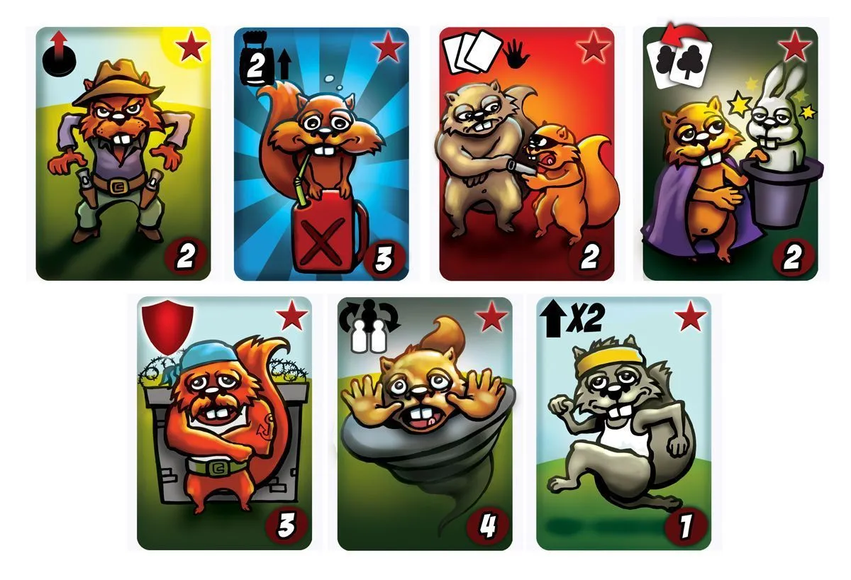 Cards can either help you or attack opponents. Use a sacred tree to provide a safe haven that others can’t destroy, and place the Divine Nut on your path, a special treat that can be claimed only after taking a nut from the stash. Take chainsaws and flamethrowers to opponents’ trees, or send a bullzoer up their trail to demolish trees one by one over several turns. If your squirrel sits in a tree that’s felled, it moves back down the trail and will remain injured until you take the time to administer first aid and get the little guy up and running once again.