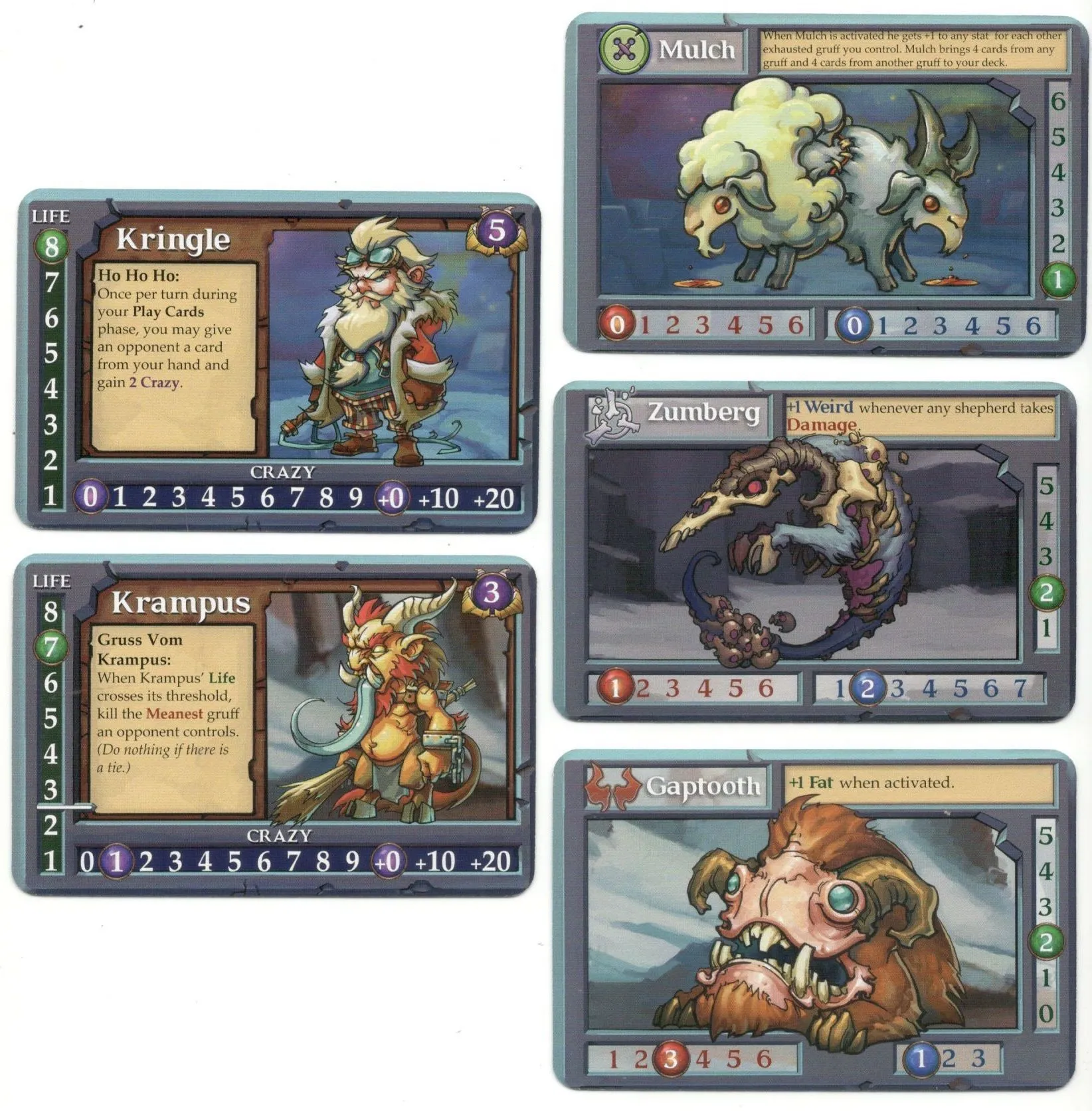 Gruff is a tactical “Expandable Card Game” about mutated monster goats. Players create a customized team of monster goats called “Gruffs” led by a shepherd. You win the game by crushing through the enemy line of gruffs and killing the opposing shepherd.