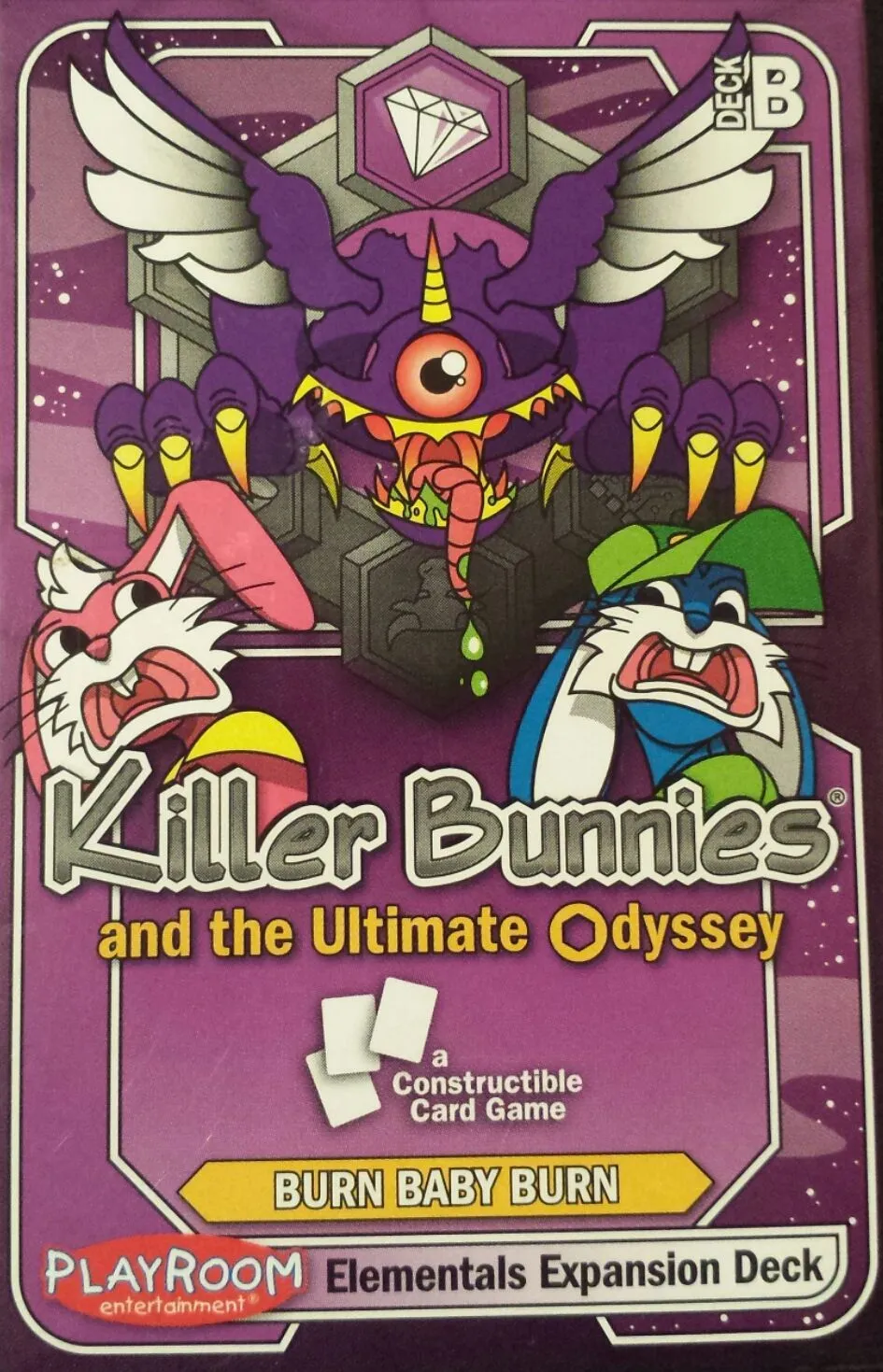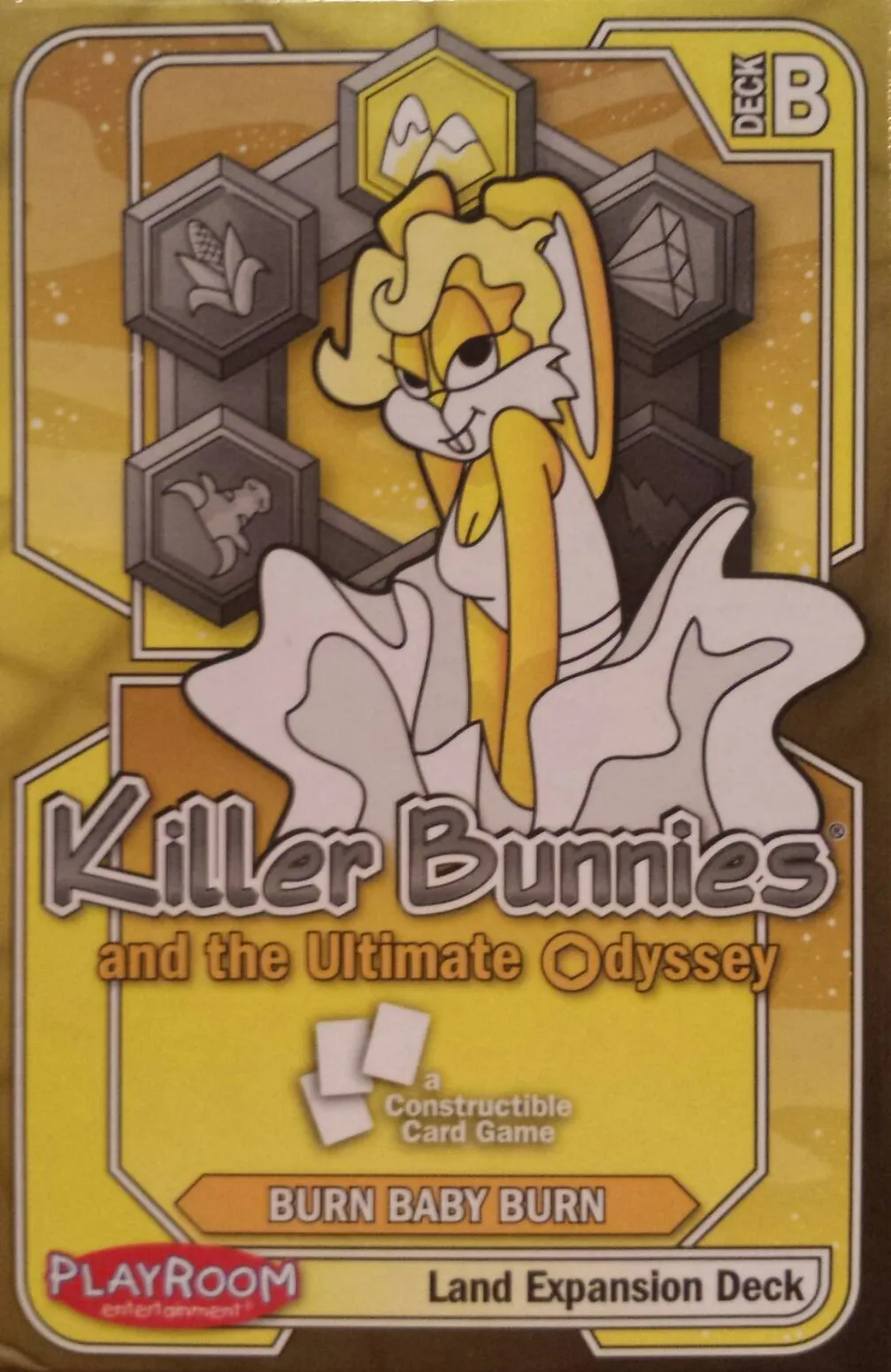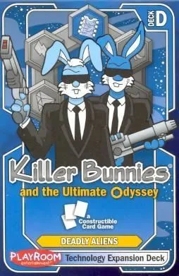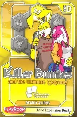 When the insatiable appetite of Killer Bunnies game fans demanded more, Playroom looked to Killer Bunnies creator and game designer Jeffrey Neil Bellinger to coordinate the development of, like other games in the Killer Bunnies family, a non-collectible game that can offer variations through different color nick-named deck options. However, this time a new desire expressed by the huge Killer Bunnies fan-base has been fulfilled: Killer Bunnies now has a constructable game variation. Though still not collectible or random, players can now buy starter decks and booster expansions for Killer Bunnies and the Ultimate Odyssey and then use any combination of those cards to form their own constructed decks to play against opponents. Unlike in Killer Bunnies and the Quest for the Magic Carrot, where up to eight players play with the same deck of cards, all sharing the same draw pile, Killer Bunnies and the Ultimate Odyssey has players each draw only from their own constructed deck of 60 cards. There are not any random packs, so players will always know which cards they are purchasing in a deck and they can buy the right products for their planned deck. For Killer Bunnies and the Ultimate Odyssey six brand new starter decks (red, violet, blue, yellow, green, or orange) allow players to construct a personalized deck with any of the cards of any deck.