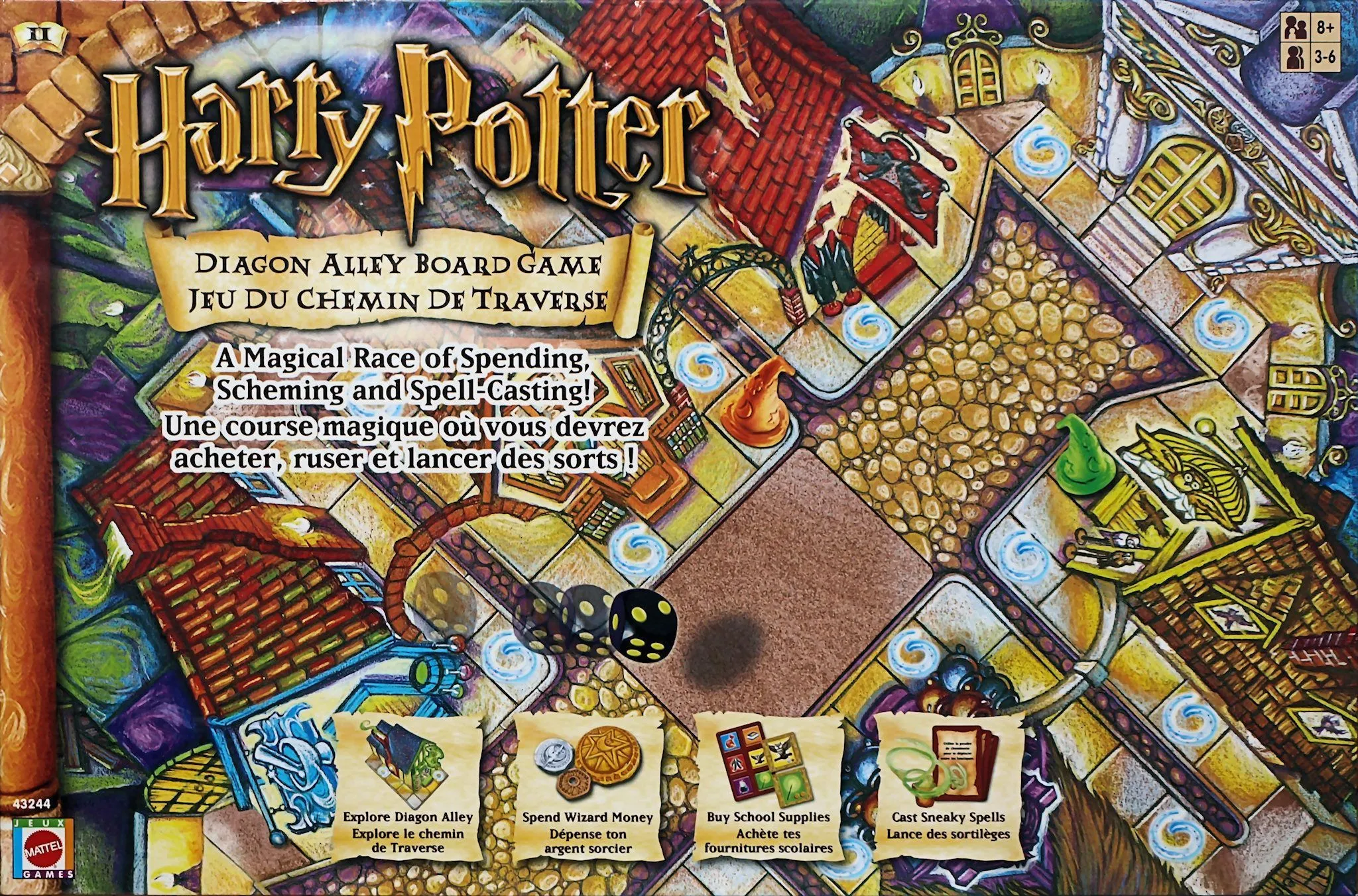 You have to pass by Gringott’s Wizard Bank several times to get enough money (plastic galleons, sickles and knuts) to purchase everything. Hogwart’s school supply list includes potion bottles, cauldrons, robes, wands, books and owls. The shops don’t have enough for everyone, so you must hurry. Spell and havoc cards let you take items, move using floo powder, close shops and more. There is also always the danger that you’ll be sent to Knockturn Alley by rolling double cauldrons.