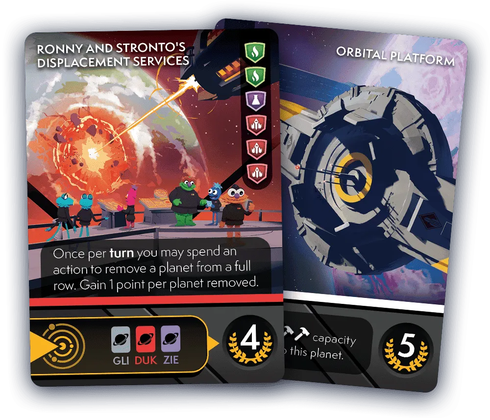 Each player gains Victory Points by claiming sets of planets and developing them with production facilities and other buildings.