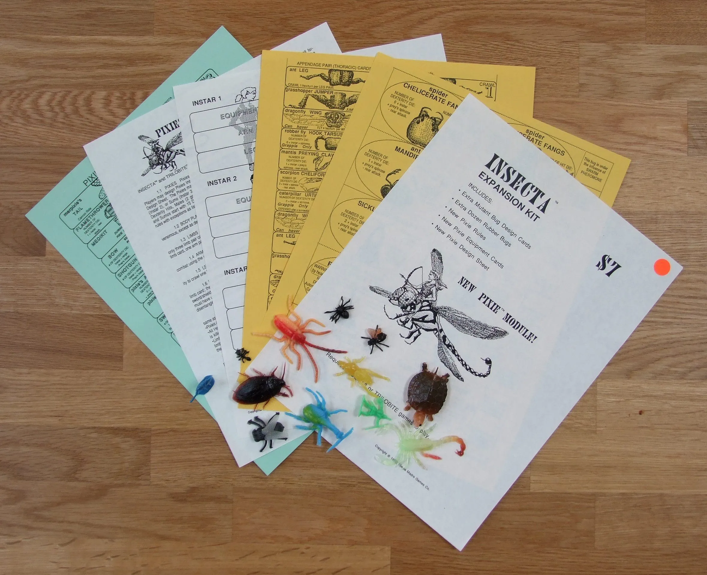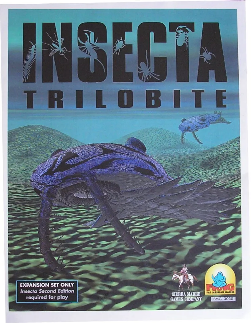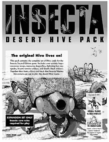 Insecta is a game of bug-to-bug conflict and combat. Players design a mutant bug team and with them attempt to escape from “The Hive,” filled with real-world arthropods and controlled by an adversarial “Hivemaster” player (somewhat akin to a dungeonmaster). The game comes with 16 mutant bug displays (6 are “starting” displays, the others are swapped in as the bugs mutate), design cards, mapsheets, minature bugs and counters.