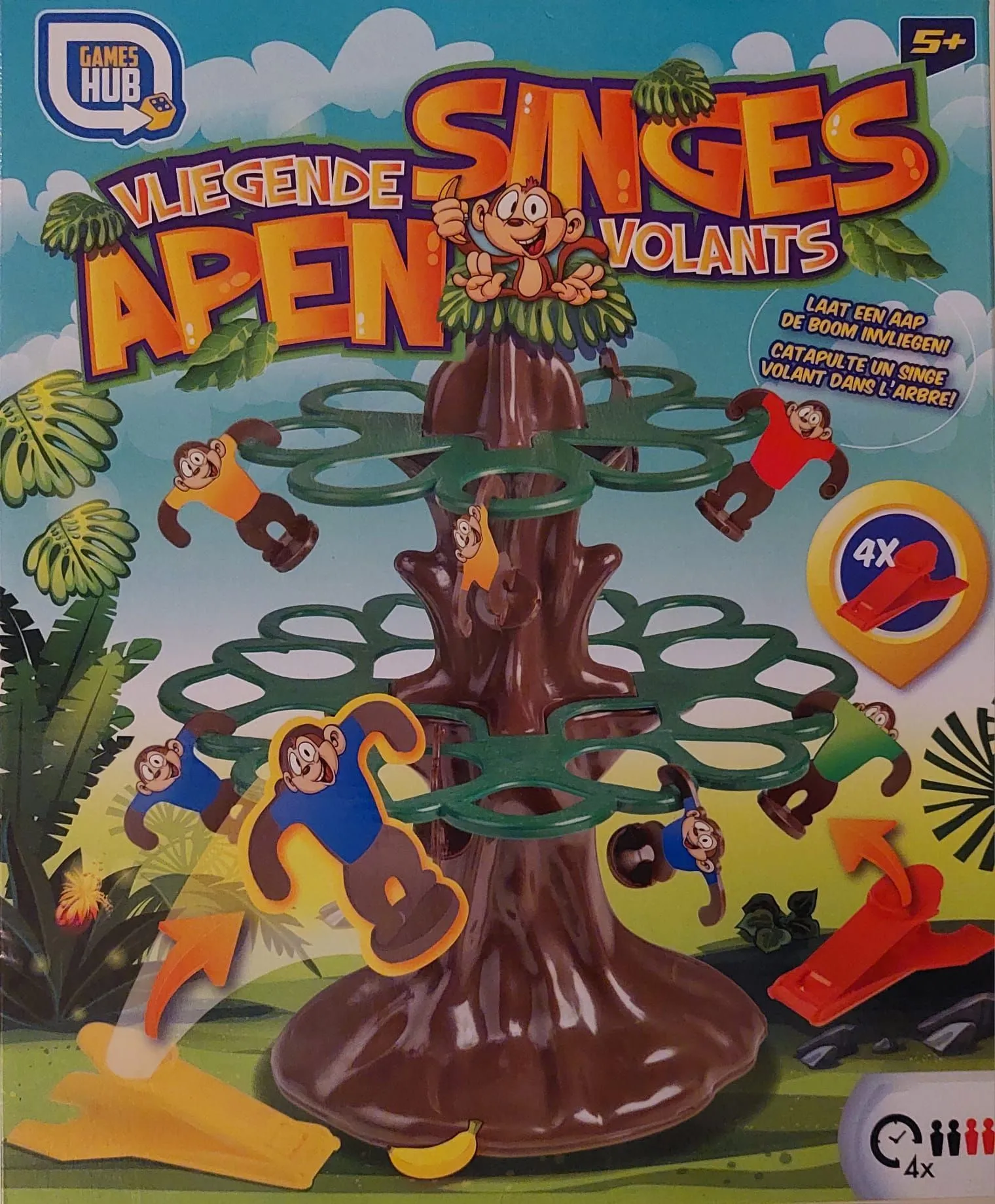 Contents: Deluxe plastic tree, 16 monkeys, 4 catapults, bananas, labels, rules.