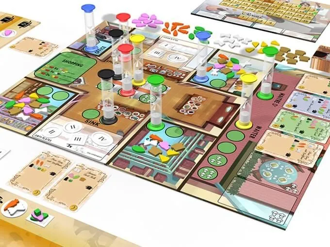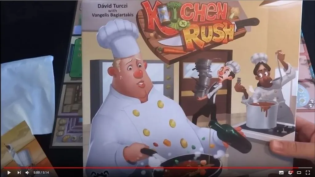 Vous venez d’hériter d’un vieux restaurant et vous devez en faire une entreprise prospère! Embaucher du personnel, commander les bons ingrédients et être prêt à servir les clients. Le succès dépendra entièrement de votre efficacité en cuisine! Kitchen Rush est un jeu coopératif en temps réel novateur qui simule l’excitation d’une cuisine de restaurant en plein coup de feu. Il le fait par le biais du placement de sabliers. Ces sabliers sont utilisés pour prendre les commandes des clients, préparer leurs plats, les servir à l’heure, acheter des provisions, nettoyer les assiettes et s’assurer qu’assez d’argent rentre chaque tour pour couvrir les salaires, les dépenses, les investissements et, espérons-le, dégager un profit. Tout sablier placé sur un espace d’action ne peut pas être utilisé ailleurs avant qu’il ne se soit écoulé. Le jeu est pour 1-4 joueurs et se joue pour 4 tours de 4 minutes.