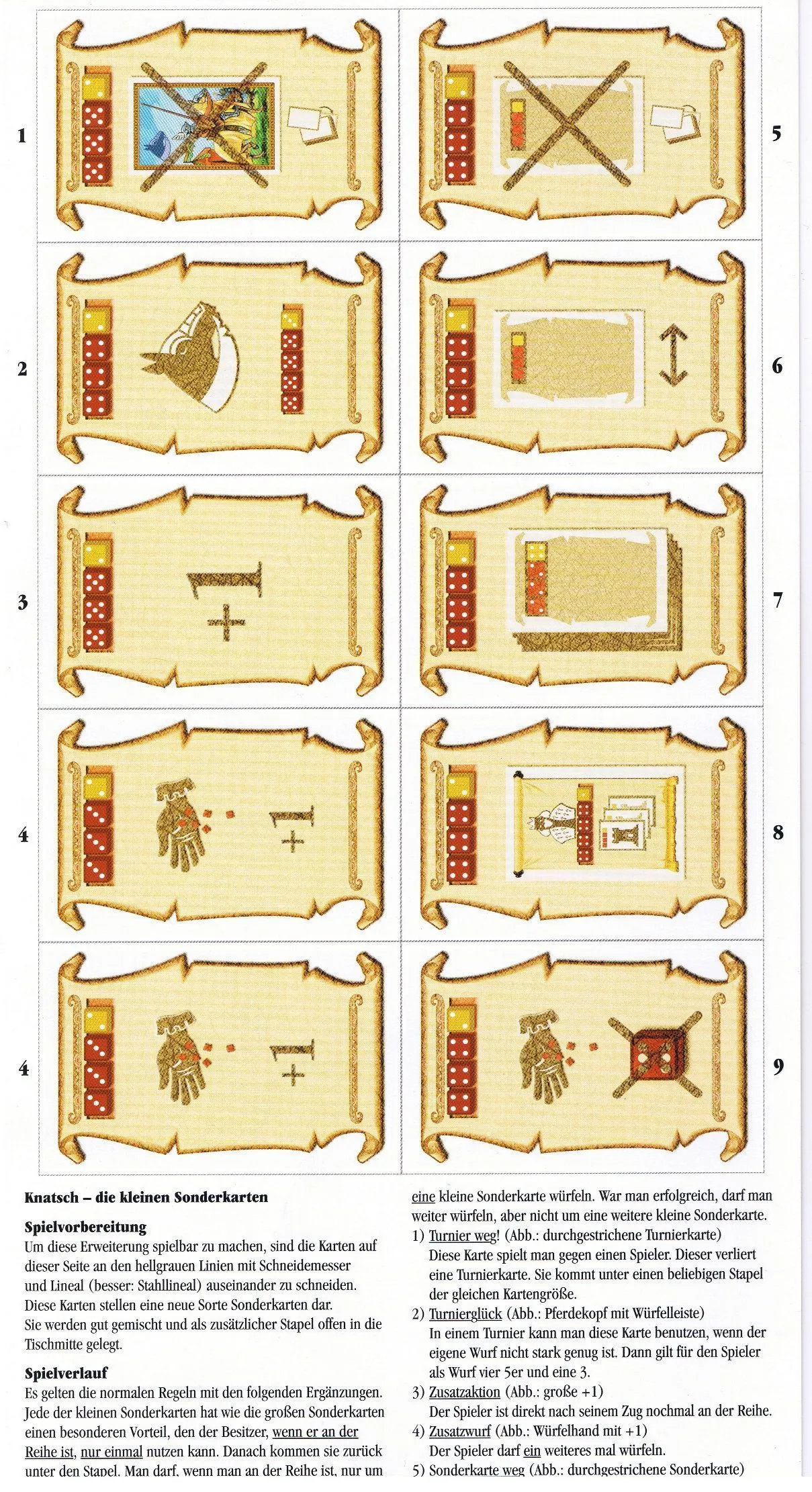 Knights, a.k.a. Knatsch, is a dice game in which players attempt to capture cards to fulfill the victory conditions. Players may win by capturing four castles, capturing three castles and toppling the King, or capturing two castles and winning three tournaments.