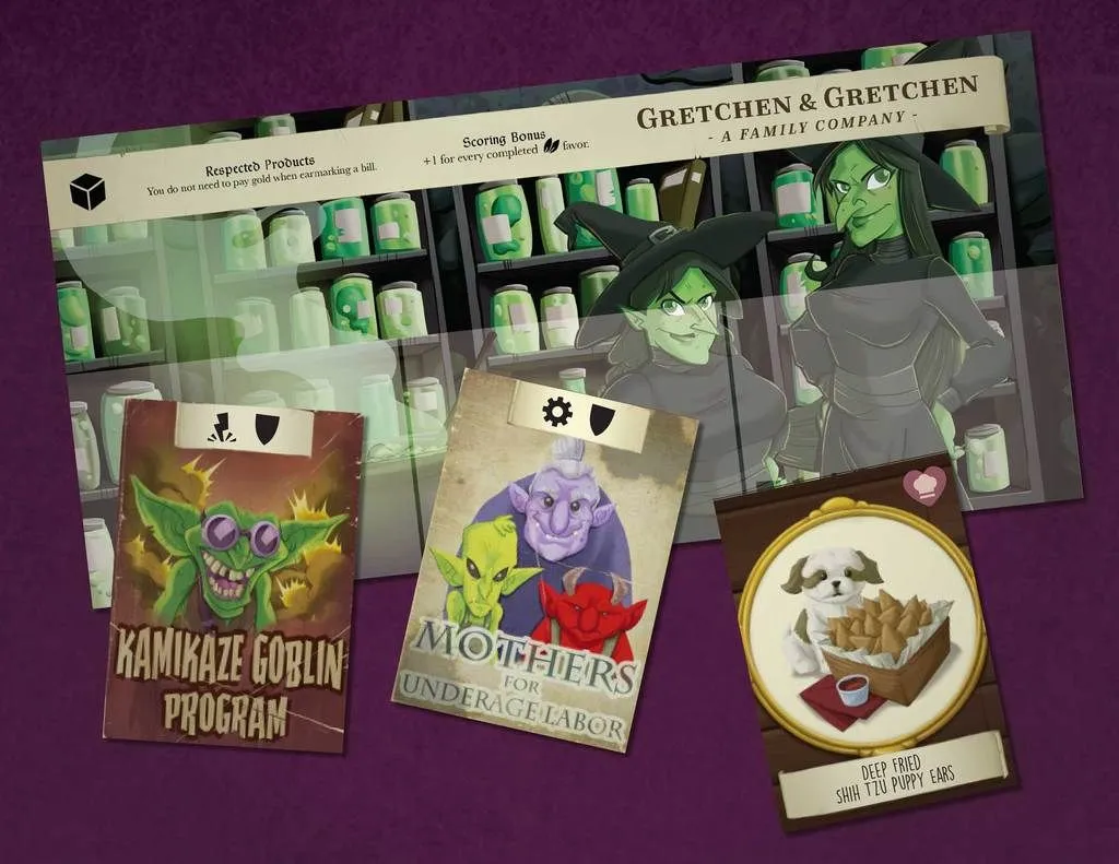 At the start of the game, each player will choose a fantasy corporation to play as (Dragons, Sorcerers, Giants, Witches, Vampires or Orcs), a Hidden Agenda which will guide their evil plan, and some starting minions (Zombies, Demons, Goblins, or Golems).