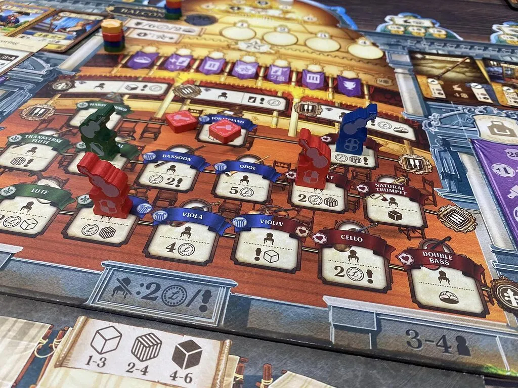 Dans Luthier - Le Génie de l’instrument, fabriquez ces instruments pour vos clients grâce au placement d’ouvriers et aux enchères cachées.
