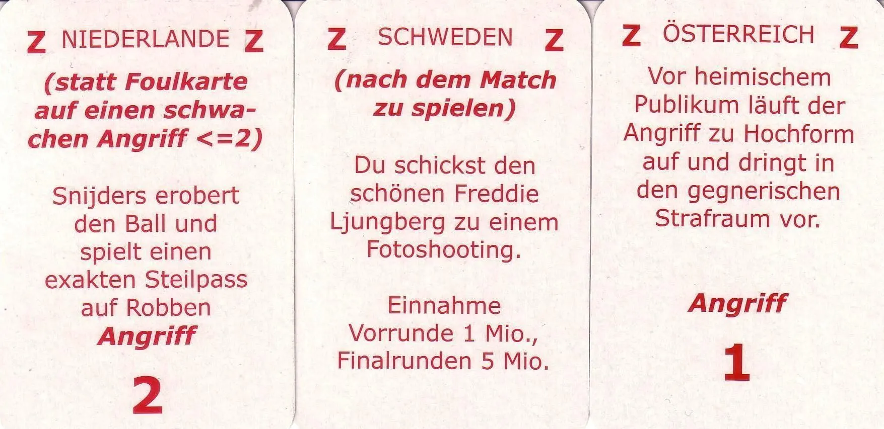 Millionen von Schwalben is a (fairly satirical) soccer-themed game. Each player manages several soccer teams in a world championship tournament, trying to become rich. Matches are played with cards and die rolling, and different teams have different abilities. The action and country cards allude to many real-life events in soccer.