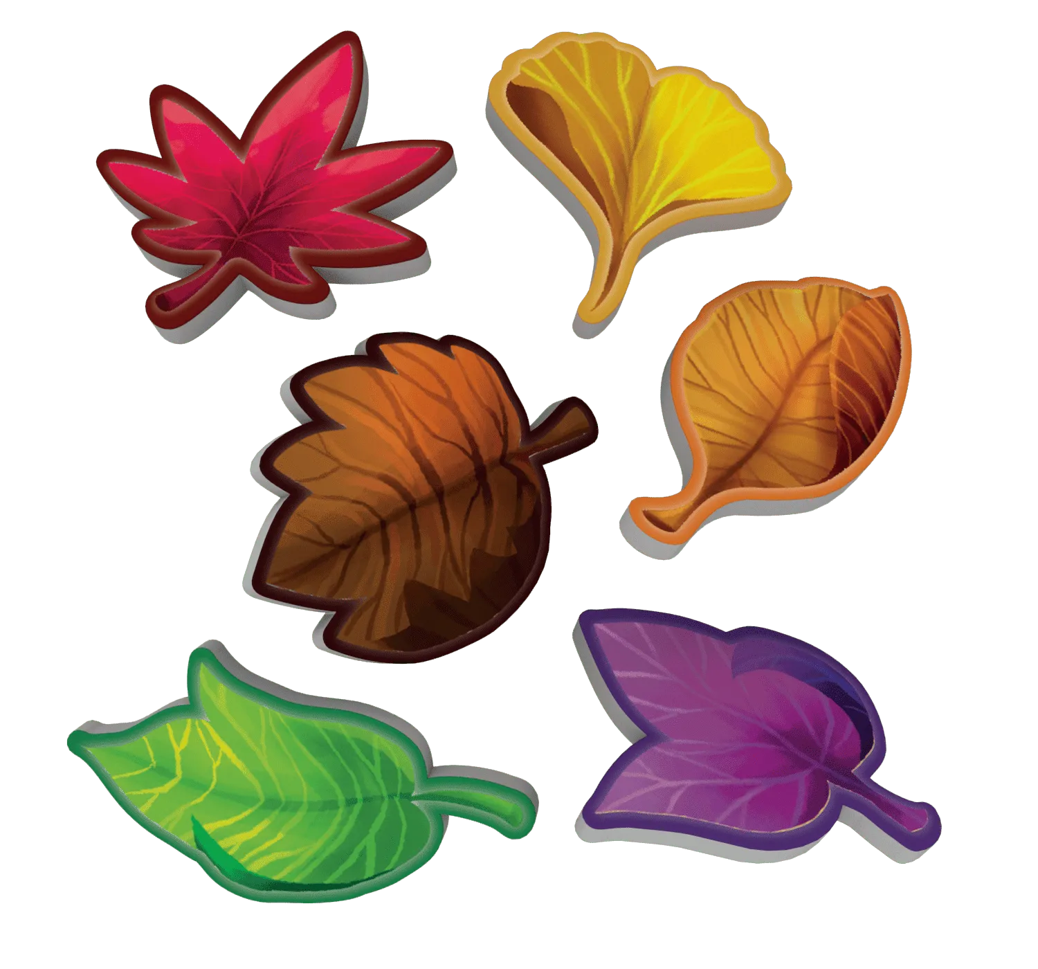You start with a hand of six leaf cards and a series of three landscape powers that combine to form a unique panorama. (For the first game, landscapes are assigned, but they can be drafted in subsequent games.) Leaf cards come in 4-6 types depending on the number of players, with values of 0-3 in each type. Start with four random cards in the central playing area, sorted by type. Place 4-6 randomly chosen objective tokens in the center of play; sample objectives are collecting the most 0s, having the most cards of a specific type, or having the highest sum of visible cards at game’s end.