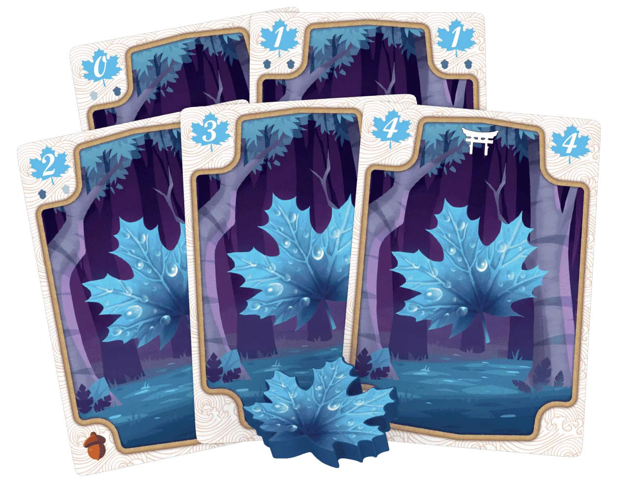 When the leaf card deck is empty or after 4-6 leaf piles are closed with a torii token, the game ends. For each pile of leaves, you score points equal to the value of the topmost card multiplied by the number of cards in the pile. Remaining acorn tokens are worth 1 point each. For each activated objective, you see who best meets the condition and therefore scores points; if the player holding the token scores, they receive 10 points, whereas anyone else who scores that objective receives 3 points. Each player scores in case of a tie. The player with the most victory points at the end of the game wins.