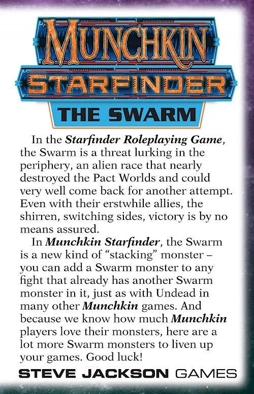 Munchkin Starfinder combines the roleplaying, backstabbing action of classic Munchkin with the lasers, alien planets, starships, and adorably deadly skittermanders from the Starfinder Roleplaying Game! Defeat The Swarm and loot the universe in Munchkin Starfinder!