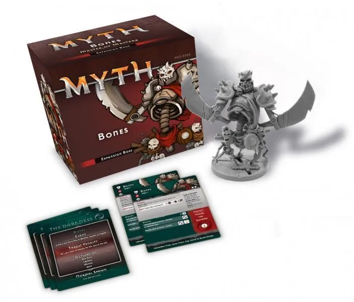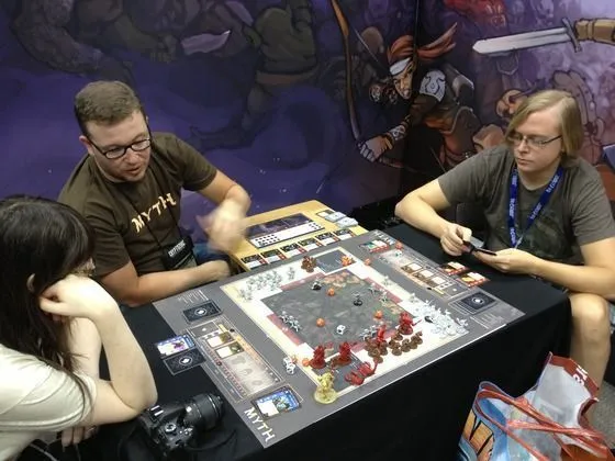 Myth is a fully co-operative fantasy game. Players take on the role of one of 5 different heroes working together to defeat the Darkness. Each hero has a different skill set which represented by a unique deck of cards. Players spend Action Points by using cards. Once a certain amount of Action Points have been spent the Darkness fights back by activating monster lairs, spawning monster captains and eventually the Boss.