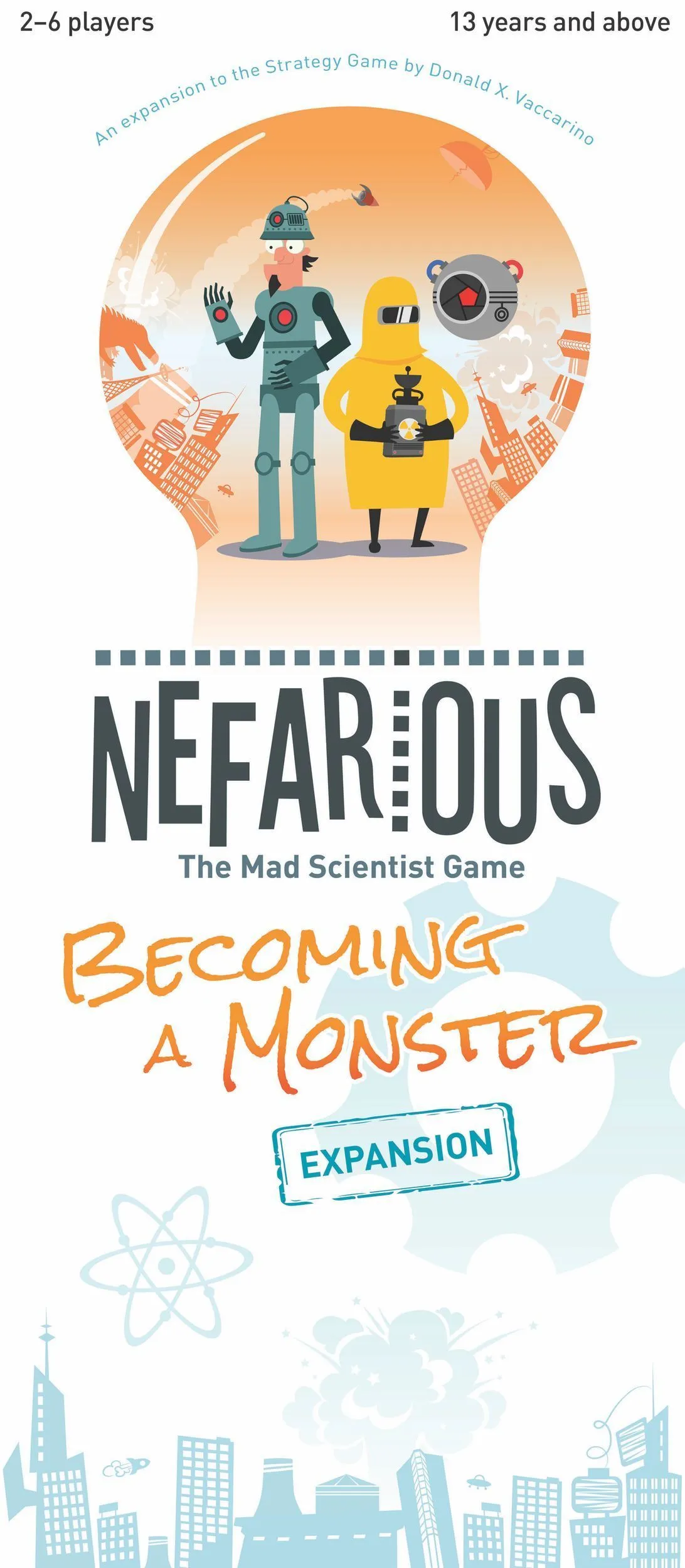 Nefarious is a quick-playing game in which the players race to build inventions like a freeze ray, cloaking device, or robotic pet before their opponents can do the same. (Interesting side note: Eighteen different artists contributed to the artwork on the different inventions in the game.)