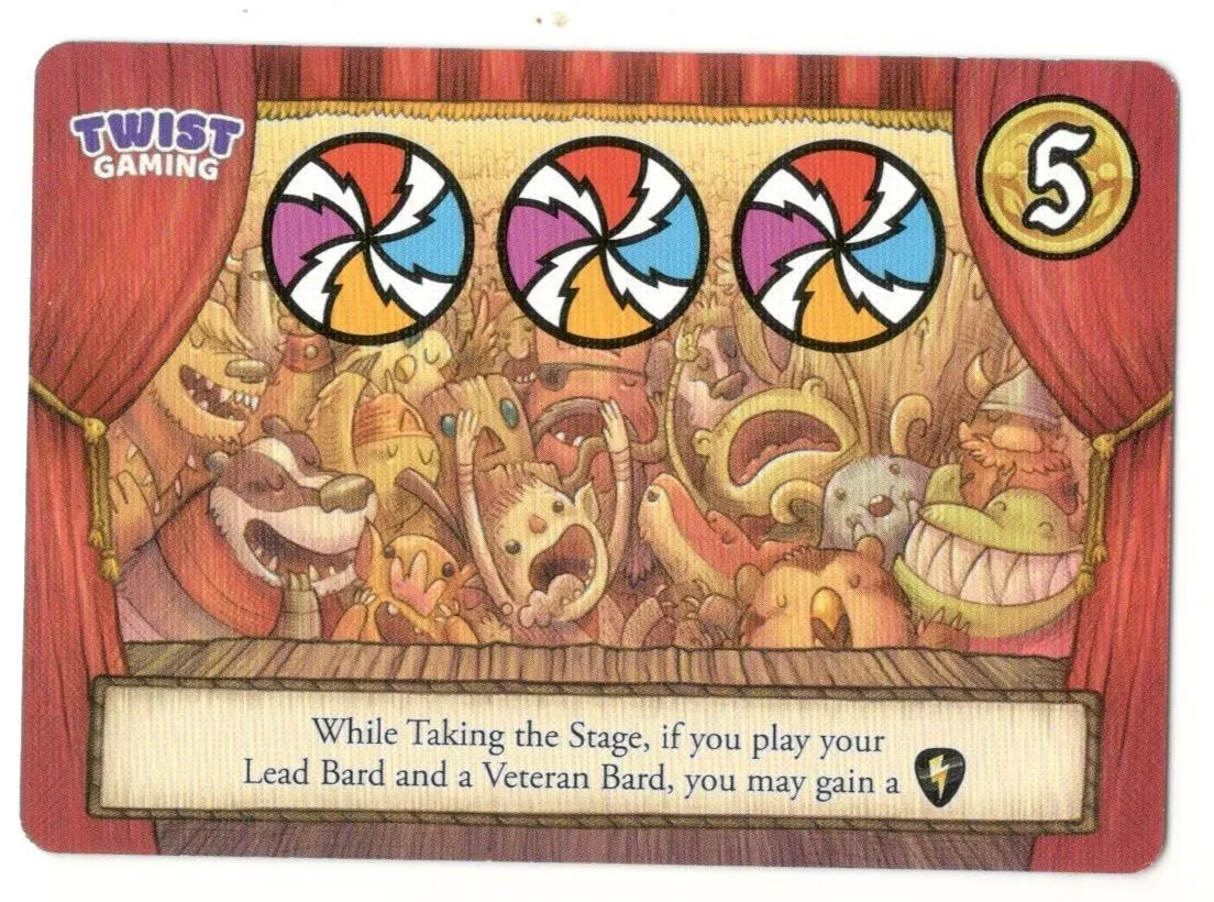 Battle of the Bards is a dice-rolling card game with aspects of deck-building set in the fantasy world of Tessandor. Players create performances, recruit bards, and work with their roadies to capture audiences in a race to become the best bard troupe.