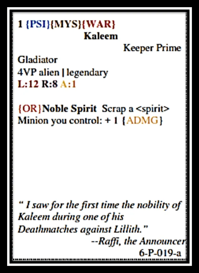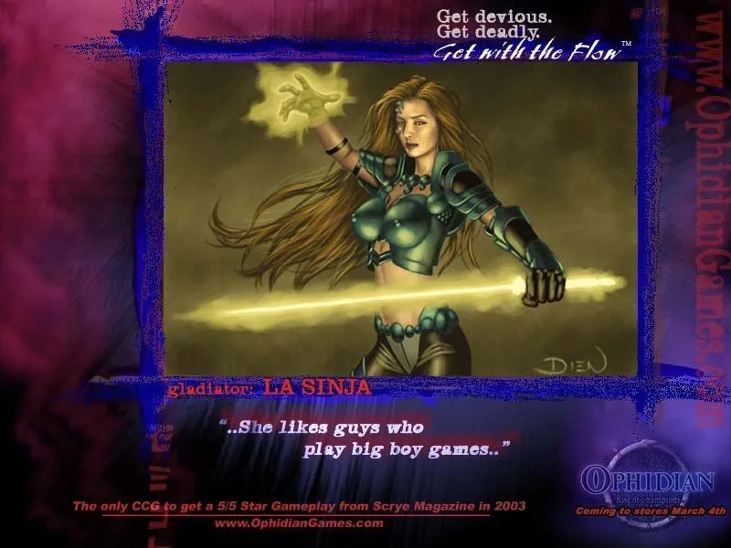 The world of Ophidian 2350 is centered around gladiatorial combat. These gladiators are aliens, bio-enhanced humans, mystics, and all sorts of otherworldly beings. Theme aside, this CCG, originally released at Gen Con 2003, has some unusual new mechanics that separate it from the pack.