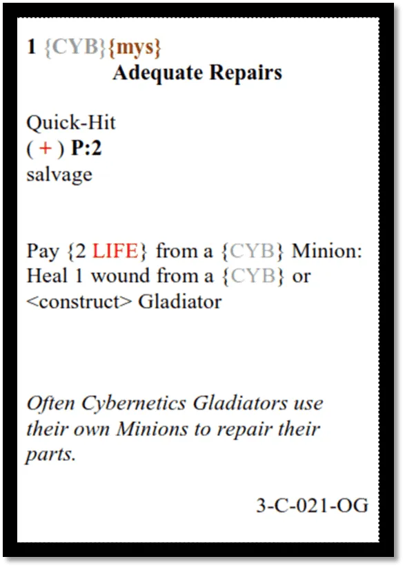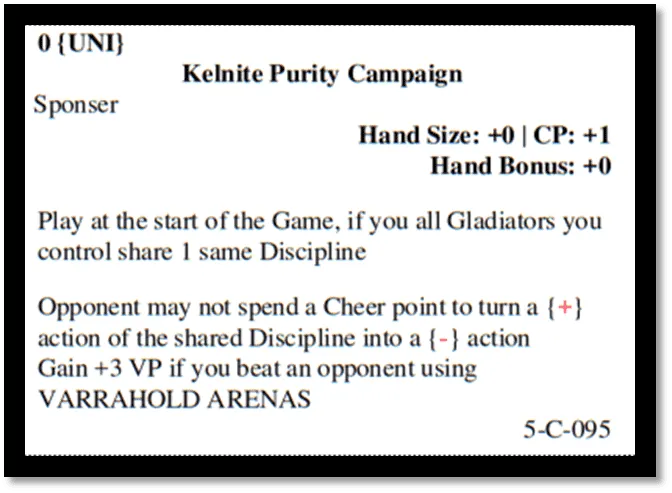 First, Players use “credits” to supply their gladiators with equipment and minions (support characters). Ophidian 2350 has a mechanic called “The Flow”. Each card has a “+” or “-” on it. Play a positively charged card, and you can keep playing cards. Play a negatively charged card and your turn ends and your opponent can start playing their cards. Basically, it helps provide a little “momentum” incentive, and adds strategy.