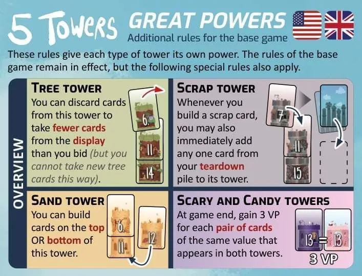 Dans le jeu les 5 Tours, les architectes s’affrontent pour acquérir des cartes et les utiliser pour construire les tours les plus hautes. Vous obtiendrez des cartes si vous êtes prêt à en prendre plus que les autres. Mais comme vous ne pouvez construire qu’une seule tour de chacun des 5 types, prendre trop de cartes à la fois peut limiter vos options à long terme.