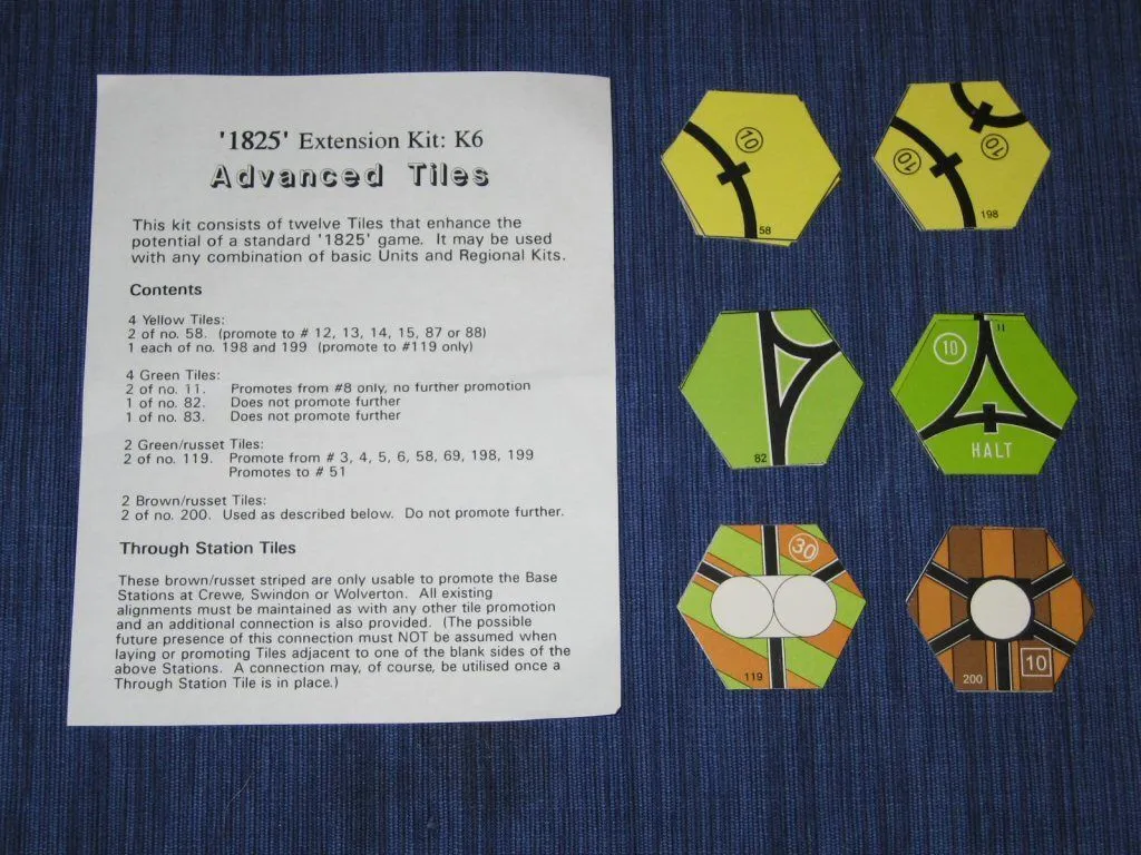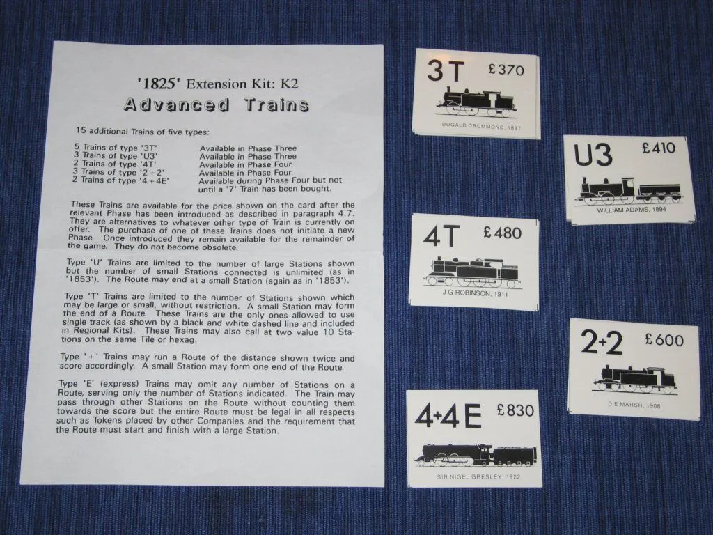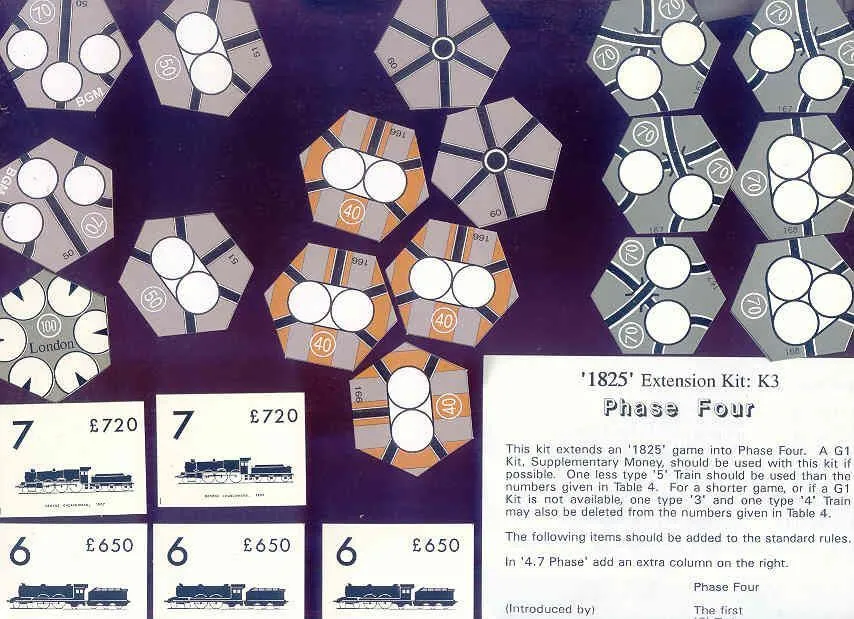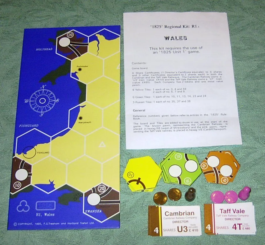 1825 is Francis Tresham’s “1829 revised” 18xx game. It is released in 3 distinct modules, or units. 1825 Unit 1 and 1825 Unit 2 broadly cover the same area as the 1829 southern board. 1825 Unit 3 covers most of the remainder of England and Scotland, and with unit 2 will cover the same area as the 1829 northern board. Along with the units are a number of expansion kits, which introduce extra money, trains, tiles, companies, and phases. There are currently three, and will be four regional kits, which cover areas of England, Scotland and Wales not included in the three base units.