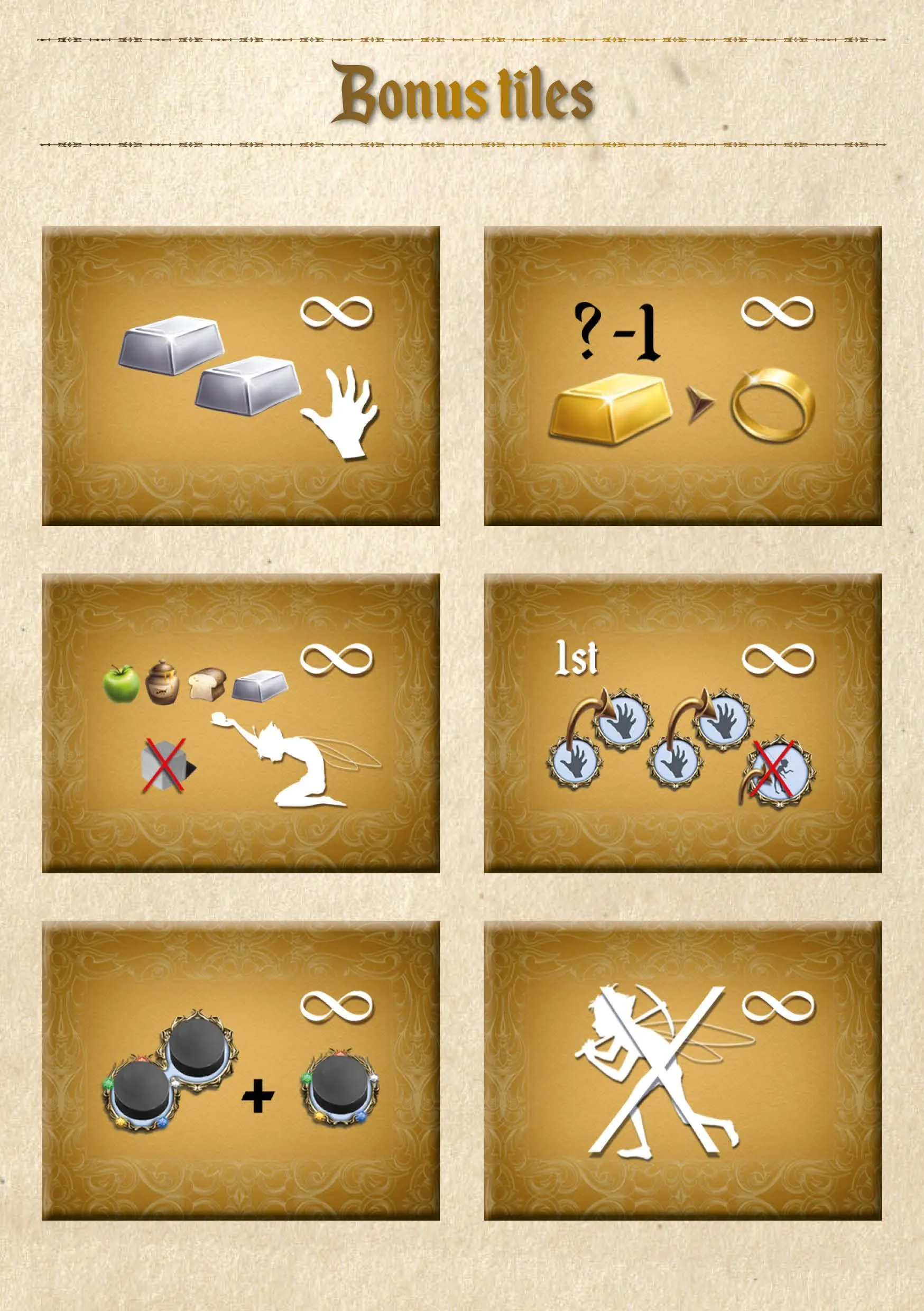 Steal food (honey, apples, bread) in Truro, the nearest human village. Perform actions with your four action disks to maximize your profits and gain more goods. There is a choice of no less than 21 different actions. For most actions, two action disks are needed unless you can enlist the help of a pixie. Offer simultaneously with all other players gold, silver or food to the Queen. She only accepts the food for which she has a craving in this round. Receive possible rewards: Promote pixies to become a faithful servant or get a better trading position to obtain gold or golden rings. Penalty points are given to the pixies that didn’t achieve enough according to the Queen.