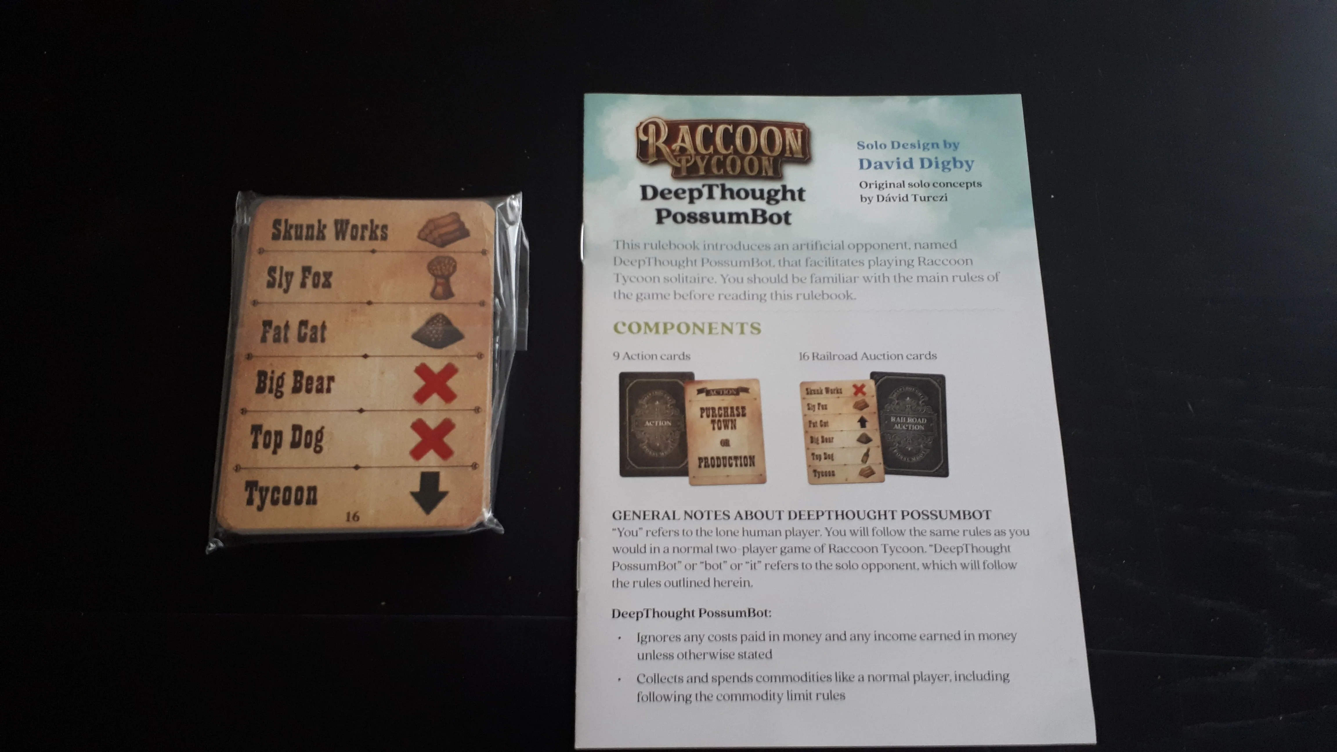 In Raccoon Tycoon, players try to produce the most valuable commodities in an ever-changing marketplace. They then use those commodities to build towns, or sell them at the best price to secure great profits that can be used to win auctions for the all-important railroads. The profits may also be used to buy powerful buildings that give the players power-ups or bonuses in production. Owning the best towns and railroads determines victory. There can be only one “top dog” in Astoria. Is it you?