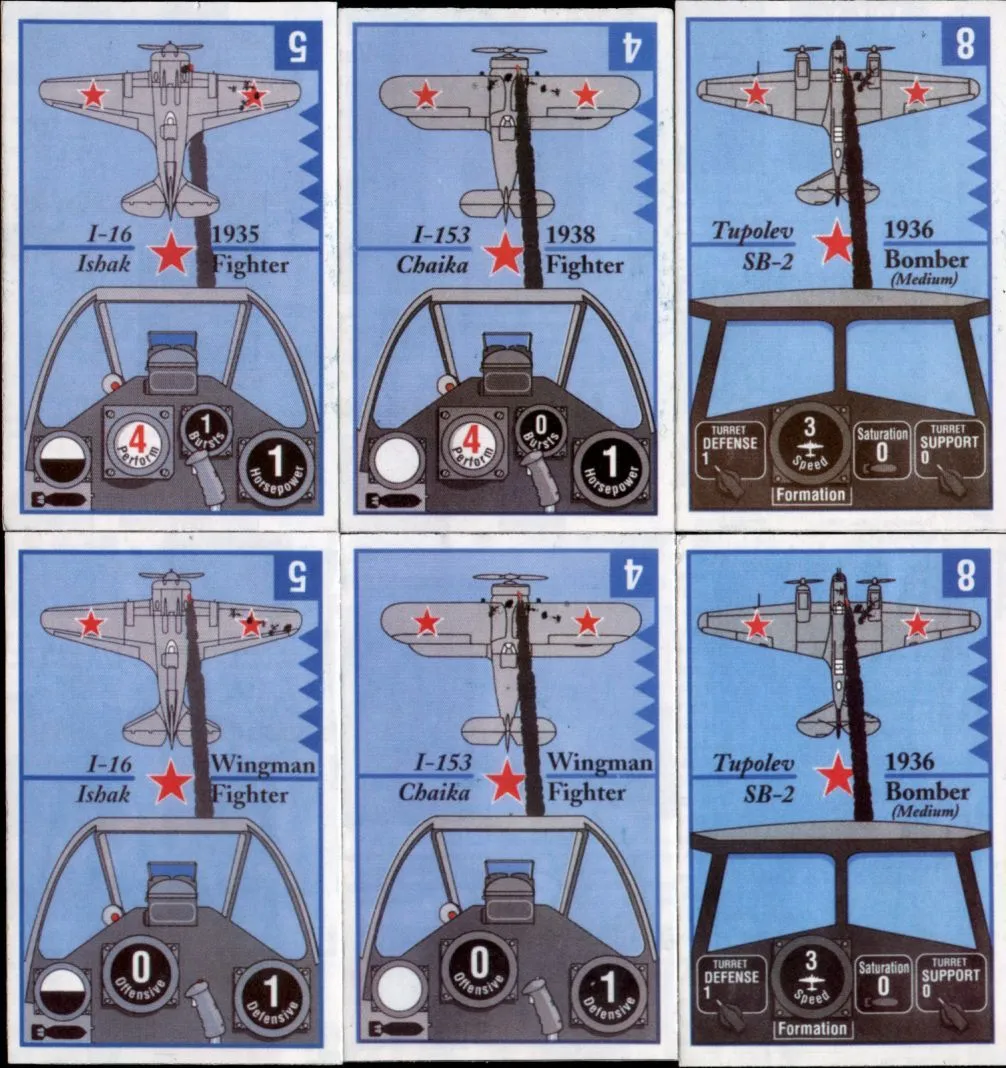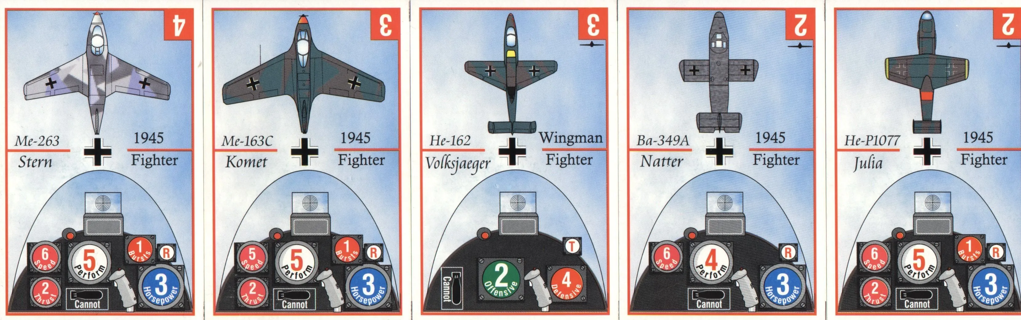 Each plane is rated with horsepower (which indicates how many card you can draw), performance (how many cards to be held), burst (the values of fire cards that can be played), etc. The number of cards in your hand abstractly represents the momentum of each aircraft.