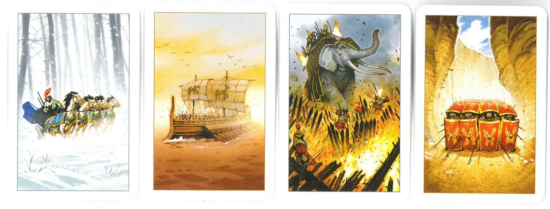 Each player controls different armies consisting of footmen, cavalry, elephants and galleys, each of which has different movement rules. In combat, each player plays two cards from his hand, with cards coming from a standard 52-card deck. Different units have different powers; the elephant, for example, doubles a player’s highest card while the cavalry doubles his lowest one. Certain combinations of cards allow for special actions, such as seeing what your opponent plays before laying down your own cards.