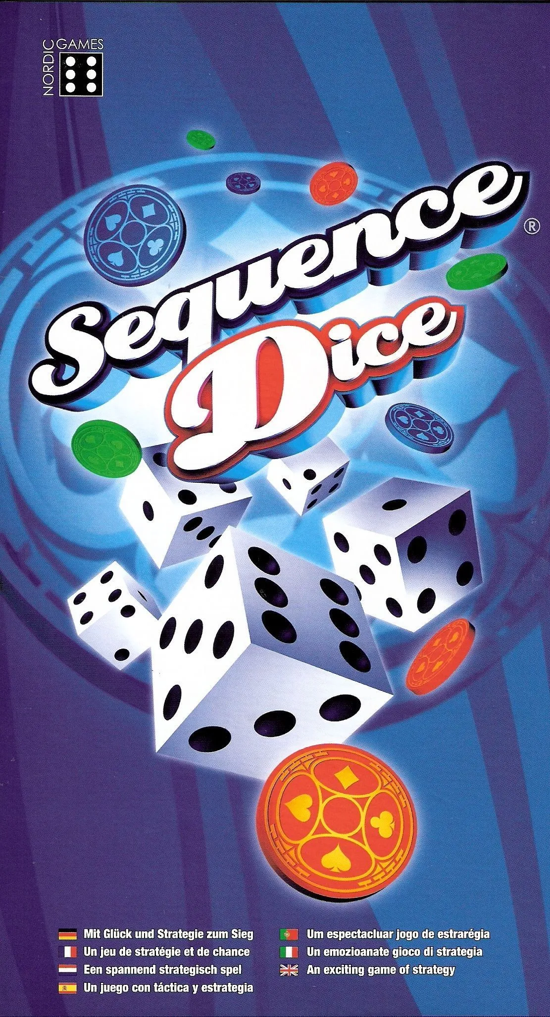 As with Sequence, players strive to get 5 of their tokens in a row. In Sequence Dice, however, players roll a pair of dice to determine where they can put their tokens. Each number has 4 squares associated with it, except for 10 which removes an opponent’s token, or 11 which is wild. The 2 and 12 additionally get bonus turns.