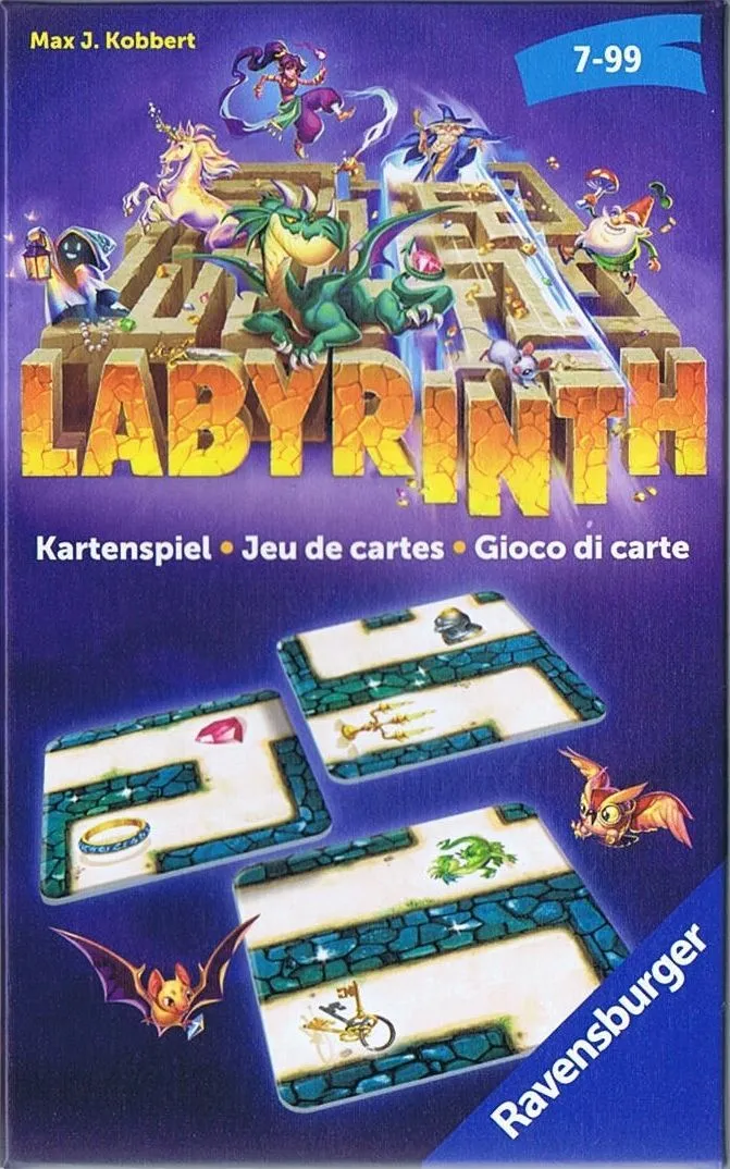Part of the Ravensburger Labyrinth Games series. Lay square labyrinth cards showing fantasy symbols like a griffin, dragon, scroll, key, gems, etc. When a symbol on the card you just laid is directly connected to one or more identical symbols on other cards, you can take those cards (but not the one you just laid), as long as the labyrinth does not become disjointed. You only hold 2 cards and draw after laying. The game ends when the draw pile is finished, most cards collected wins. A children’s game that is fun enough as a filler for adults.