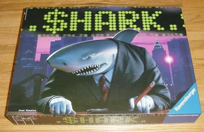 Shark is a stock-trading game slightly reminiscent of Acquire in that abstract play on the game board determines the share values of the various companies. The similarities end there, though, as Shark is more free-wheeling than Acquire.