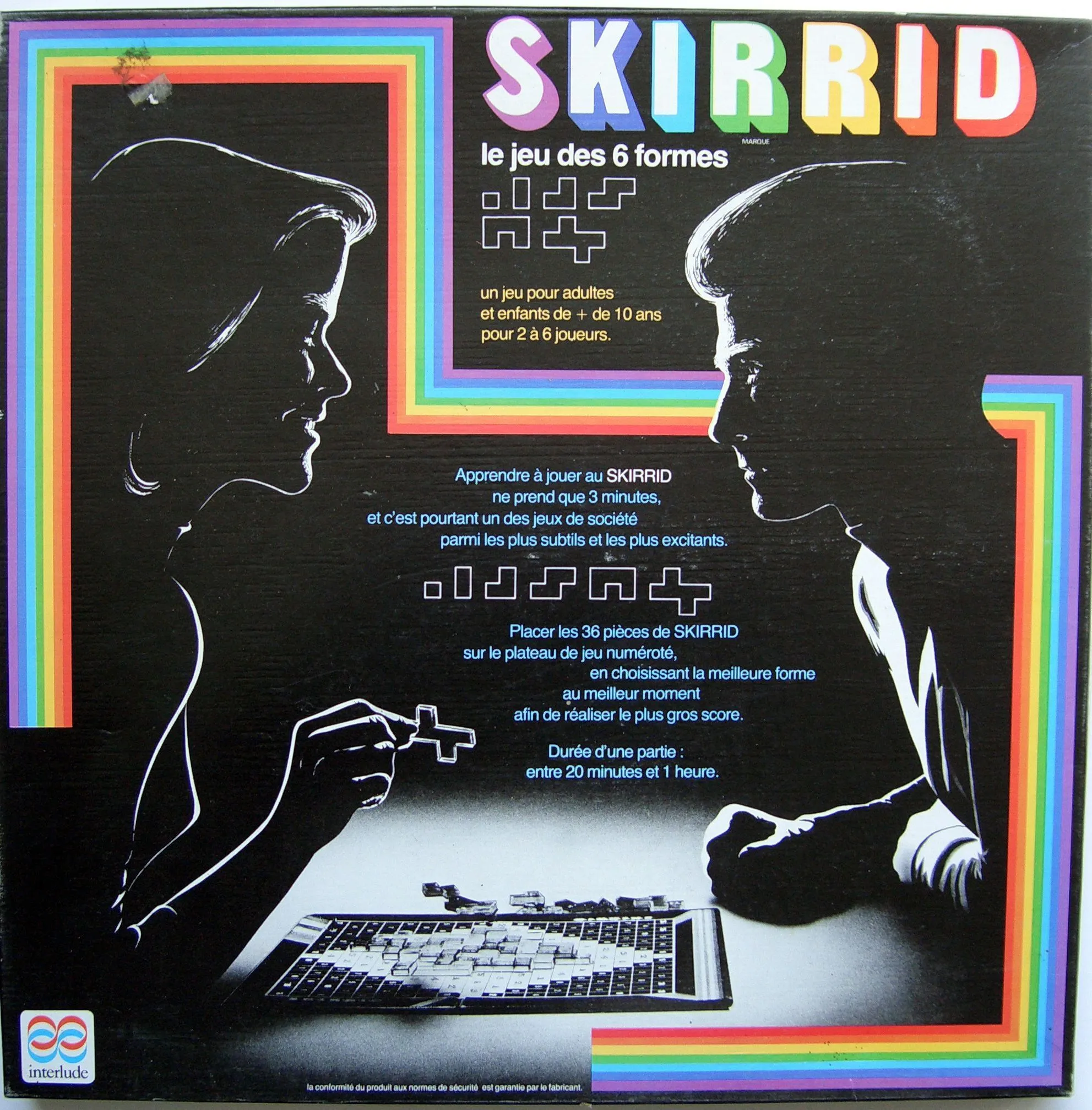 Coming in a very awkward-sized box (42 x 42 x 3 cm), this is a distant relative of Scrabble. The 19x19 board is colored in two distinct areas, the central lozenge (just reaching the edges) being called the arena. The squares are sprinkled with numbers, of values increasing near the outer corners. The players have sets of 18 (for the two-player game) clear and smoked plastic of tangram shapes, some of which have a 2 or 3 over a certain square.