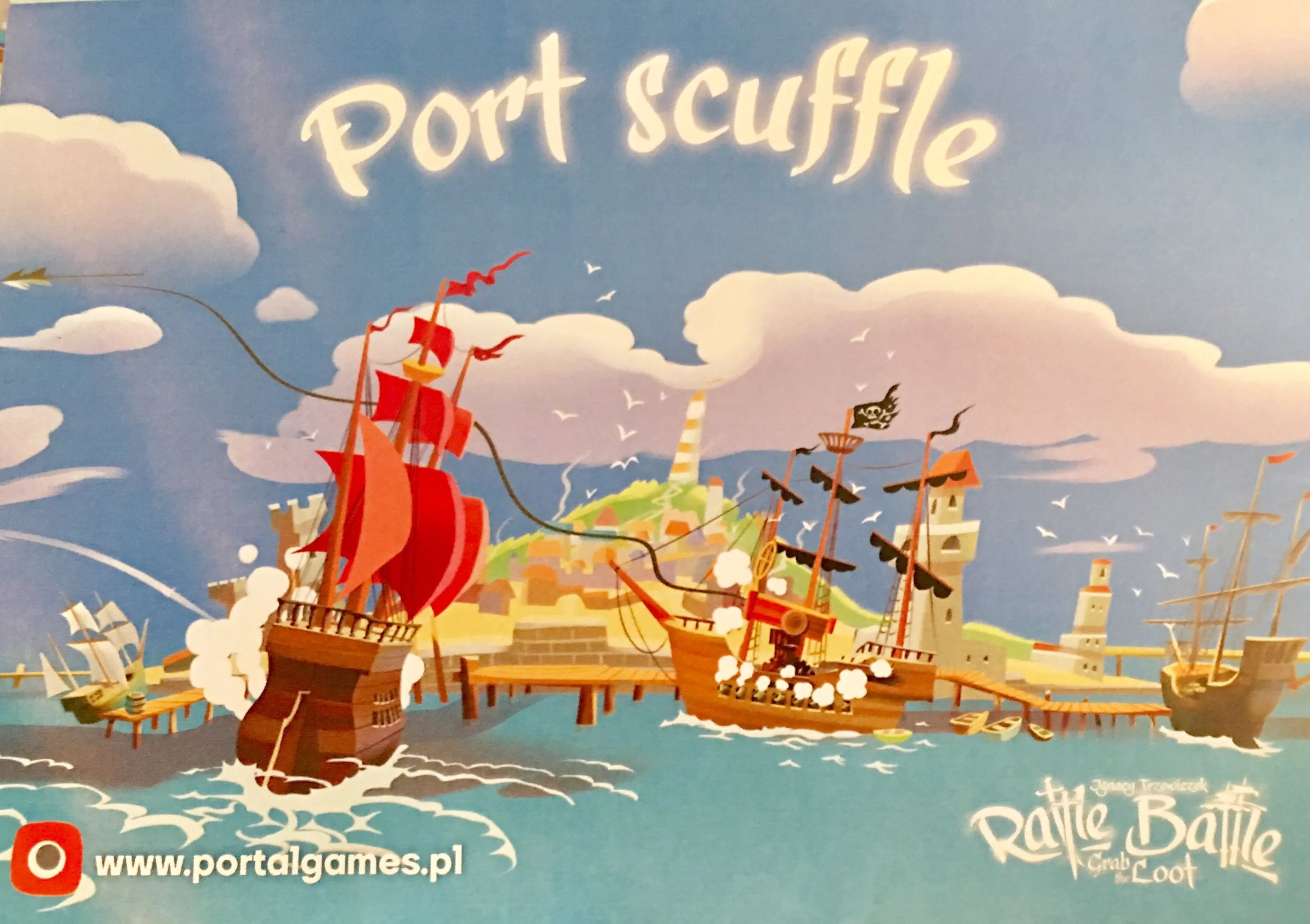 Rattle, Battle, Grab the Loot takes the fun of rolling dice and combines it with a rich scenario deck to make each game play differently. Each round, the players battle it out with merchant vessels and other ships, trying to grab as much loot as possible. One player takes dice from all the players, rattles them in their hand, then tosses them into the game box to resolve the battle. Where your dice land in the box, in addition to the symbols rolled, determines the results of the battle, then players claim their loot. Players may now return to port to upgrade their ship, hire new crew, or give their goods to the Pirate King for his favor.